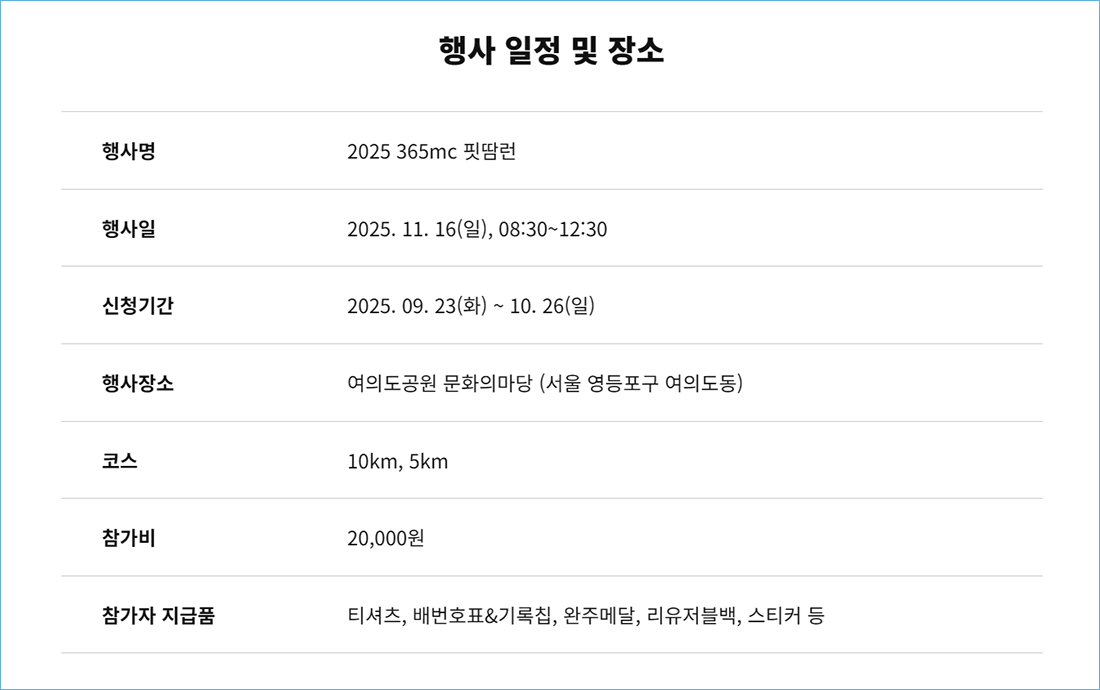 매년 다양한 러닝 대회가 열리지만, 요즘은 브랜드 홍보를 겸한 러닝 행사도 많습니다. 그중 365MC 핏땀런 2025는 참가비가 저렴하면서 기부와 연계돼 있어 관심을 가질 만한 행사입니다. 사실 브랜드 홍보 대회라 다소 상업적이라는 생각이 들 수도 있지만, 오히려 혜택이 풍성한 경우가 많습니다.