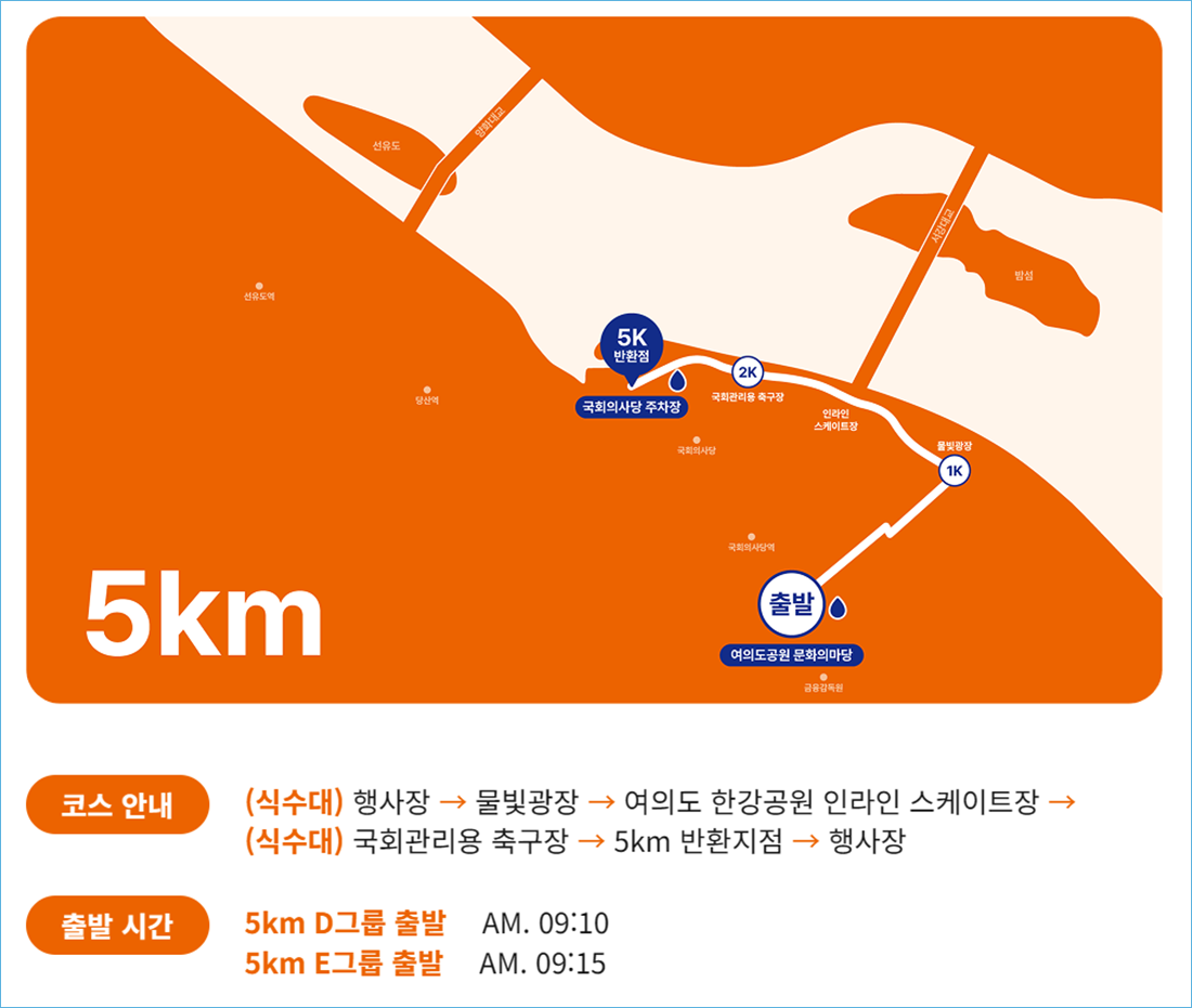 10km 코스는 여의도공원을 출발해 양화나루에서 반환하고 다시 출발 지점으로 돌아오는 방식이며, 5km 코스는 A~C 그룹과 D~E 그룹으로 나누어 5분 간격으로 출발합니다.