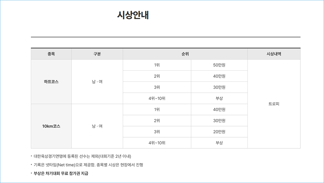 남녀 각각 1~10위까지 시상이 이루어지며, 1~3위는 상금, 그 외 순위는 부상 및 트로피가 수여됩니다. 전국 규모 대회 중에서도 상금 수준이 높은 편이라 경쟁력 있는 러너들에게도 매력적인 대회로 꼽힙니다.4️⃣ 기념품 구성