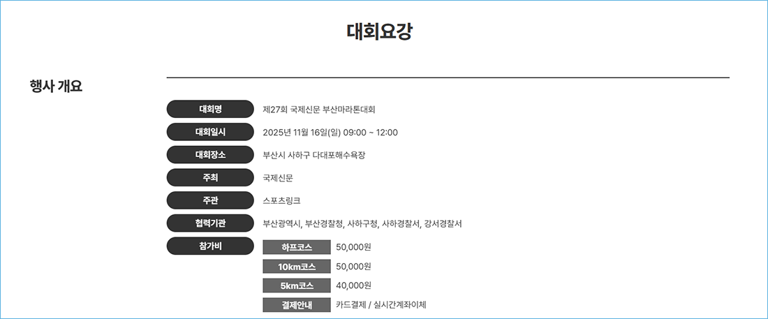 이번 대회는 부산시민뿐 아니라 전국의 달리미들이 참여하는 대표적인 가을 마라톤 대회로 꼽히며, 접근성과 풍경, 운영 면에서도 좋은 평가를 받고 있습니다.