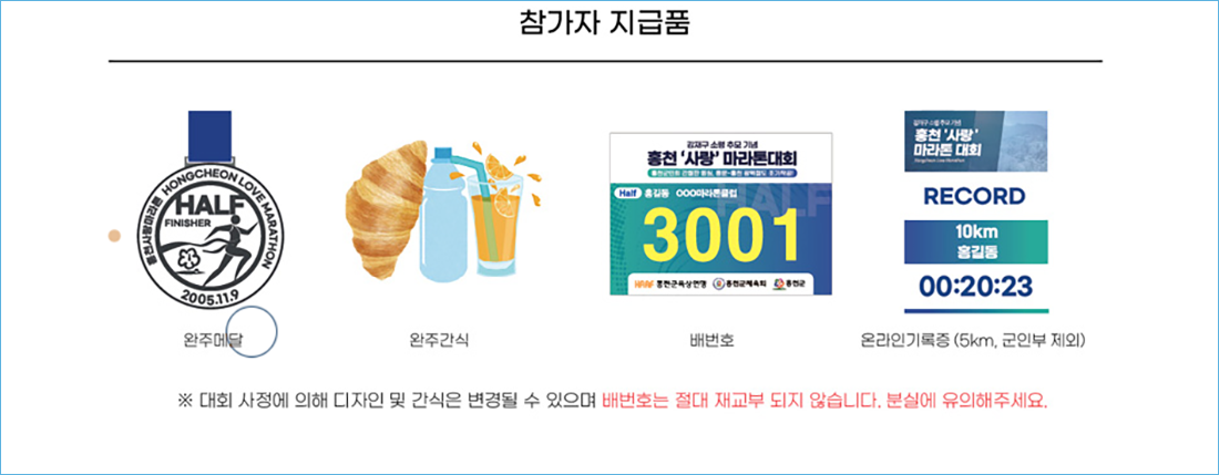 완주자는 메달과 간식, 온라인 기록증(하프·10km만 해당)을 받을 수 있습니다.