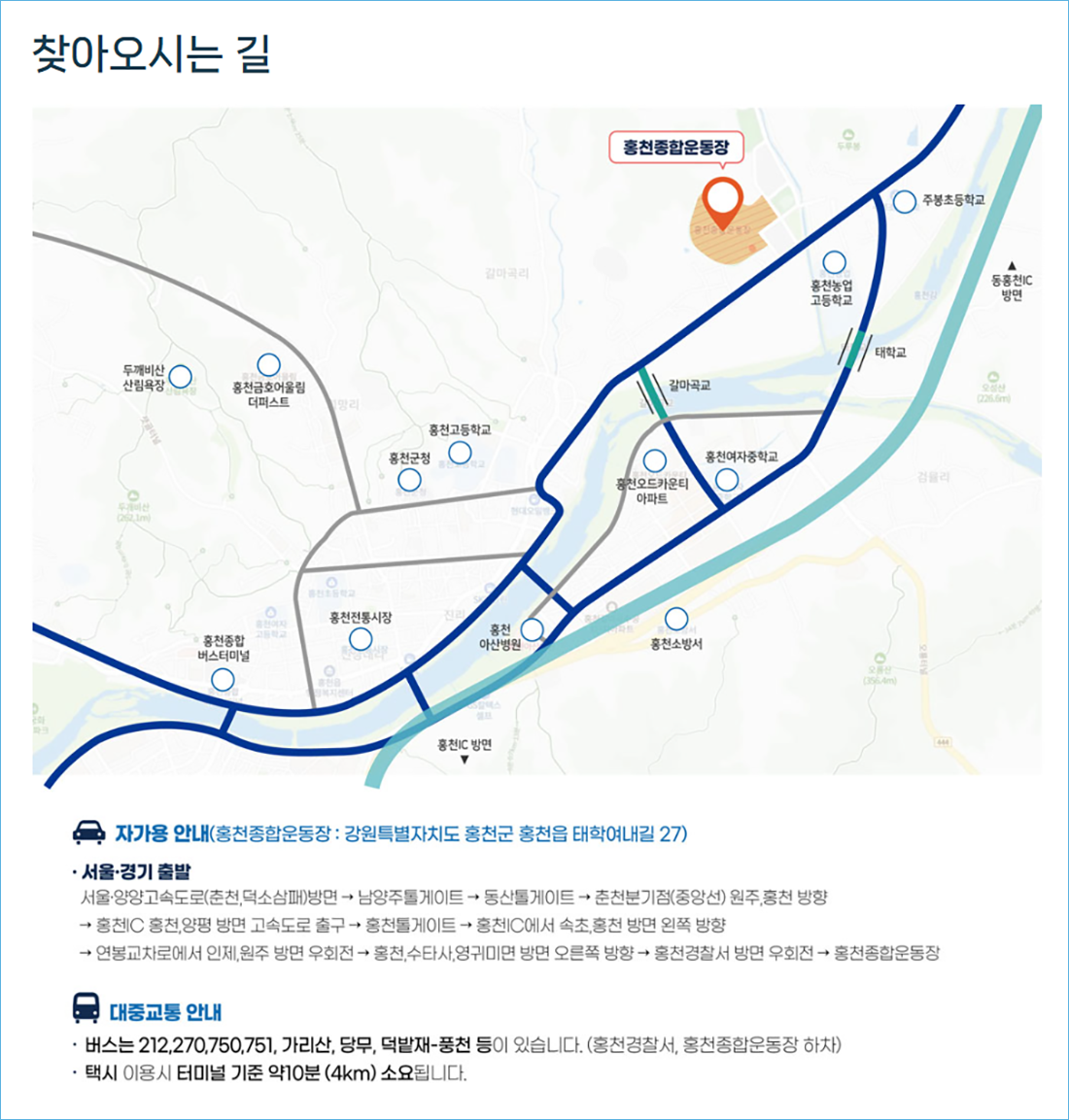 - 버스: 홍천터미널 하차 후 택시로 약 10분 (거리 약 4km)