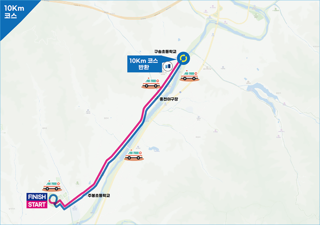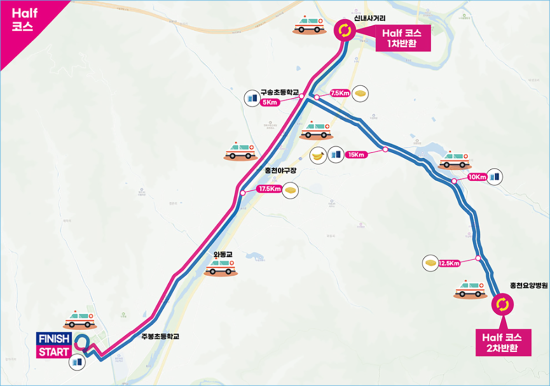 🔸 하프코스: 홍천강을 따라 신내사거리와 굴운저수지까지 이동 후 복귀 (2회 반환점)