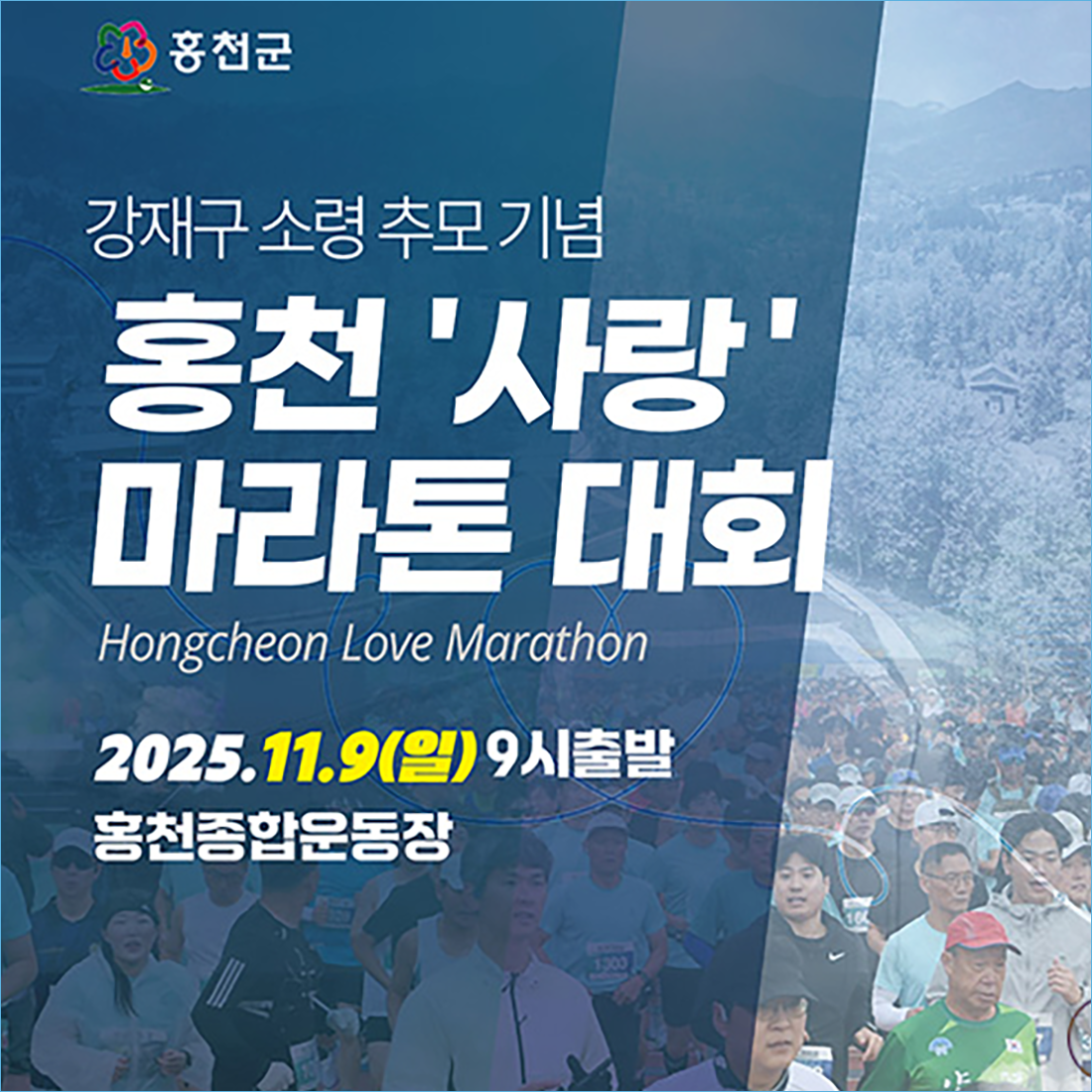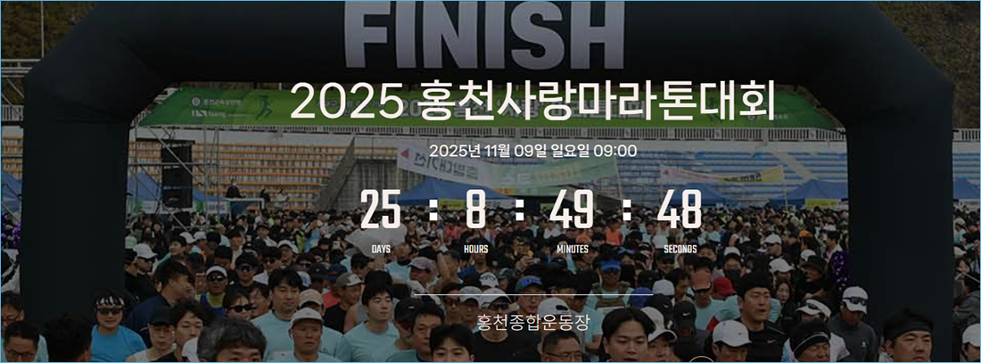 2025 홍천사랑마라톤대회는 강원도 홍천종합운동장에서 출발하며, 올해 일정은 2025년 11월 9일(일) 오전 9시입니다.