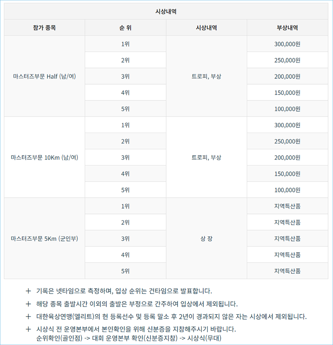시상은 하프, 10km, 5km(군인부) 부문별로 마스터즈 1~5위까지 진행됩니다.
