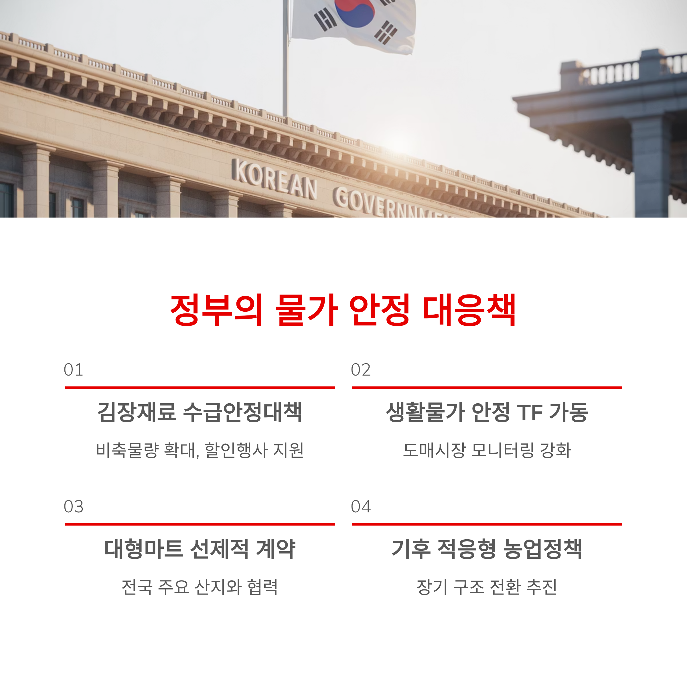 다만 주의할 점도 있어요. 최근 이어지는 가을 장마 등 기상 이변은 변수로, 일부 지역에서 무름병이 발생하고 있어요. 하지만 전체 공급량이 늘어나 김장철 가격 급등 가능성은 낮다는 게 전문가들의 분석이에요.5. 정부의 물가 안정 대응책