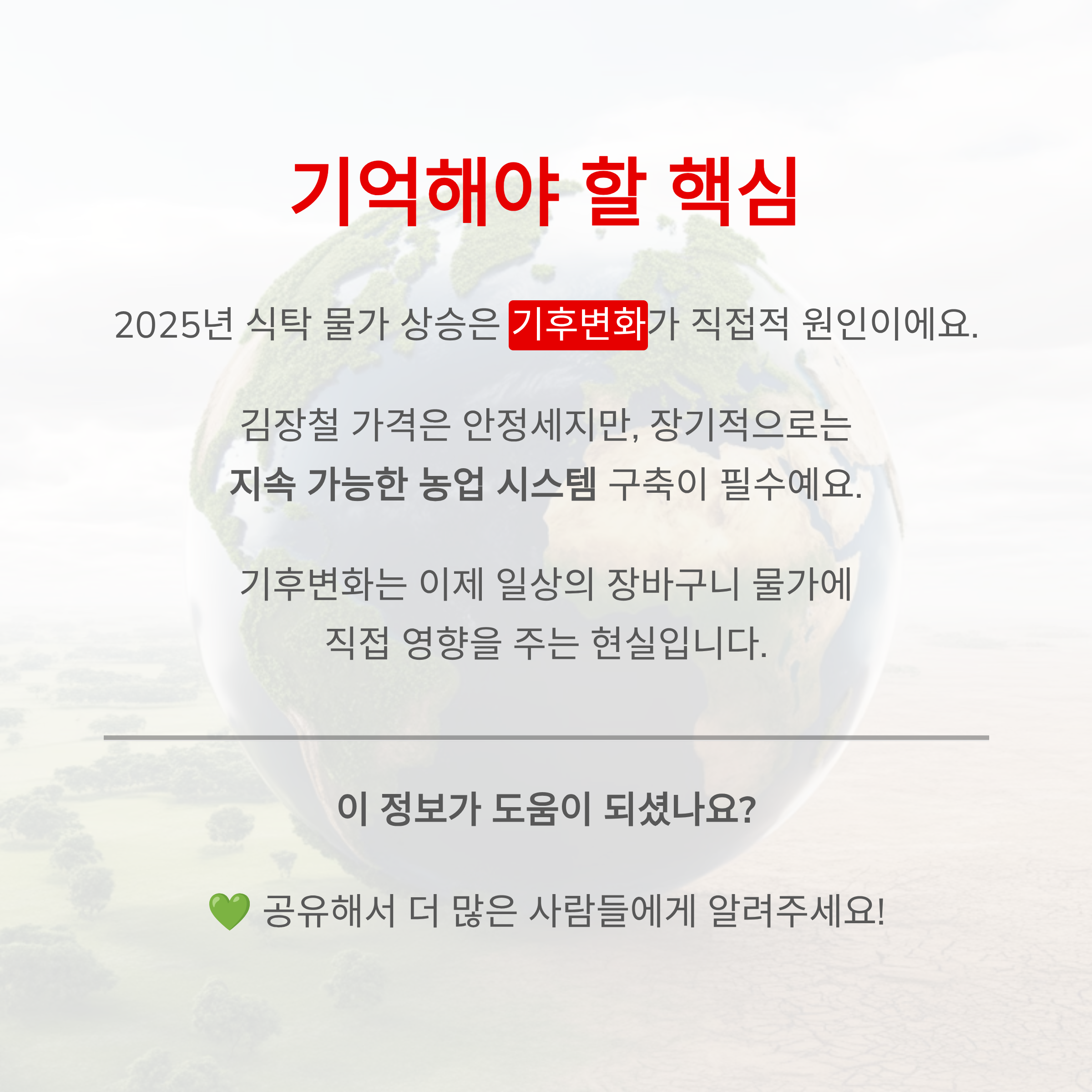 전문가들은 "단기적인 물가 변동은 불가피하지만, 공급망 관리와 기후 적응형 농업정책이 중요하다"고 조언해요. 단순히 가격만 잡는 게 아니라 기후변화에 대응하는 농업 구조 전환이 핵심 과제라는 거죠.✅ 마무리하며