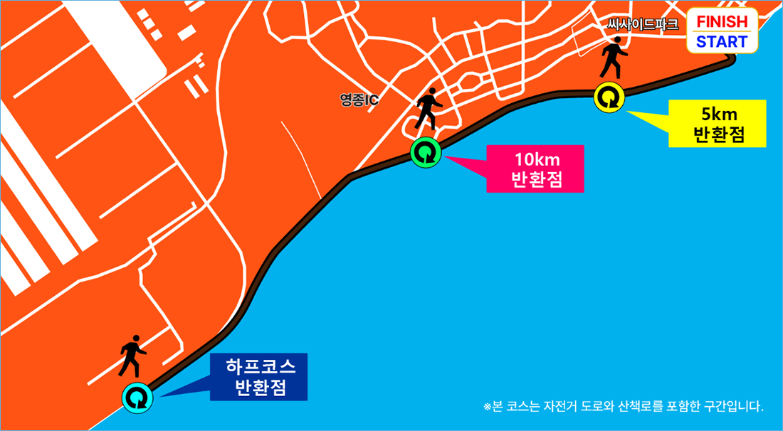 시즌 마감 마라톤대회 2025는 하프(21.0975km), 10km, 5km 세 가지 코스로 구성되어 있어요. 모든 코스는 영종도 씨사이드파크의 해안 자전거도로를 기반으로 하며, 거리에 따라 반환 지점이 달라지는 방식이에요.