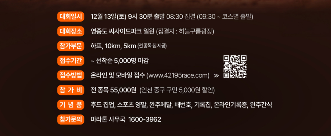 2025년을 달리기로 마무리하고 싶으신가요? 인천 영종도의 탁 트인 바다를 배경으로 펼쳐지는 시즌 마감 마라톤대회 2025가 12월 13일 개최됩니다.