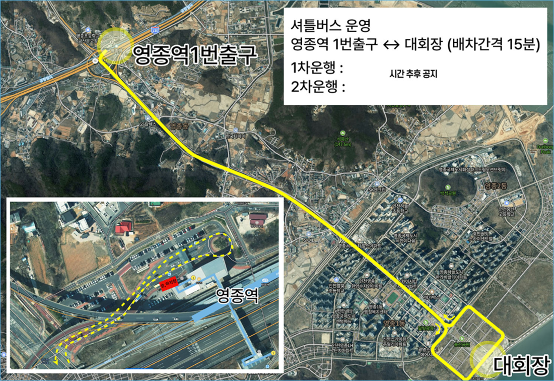 대중교통을 이용하시는 분들은 공항철도 영종역 1번 출구에서 하차 후 셔틀버스를 이용하시면 됩니다. 셔틀버스는 15분 간격으로 운행되니 여유 있게 출발하세요.