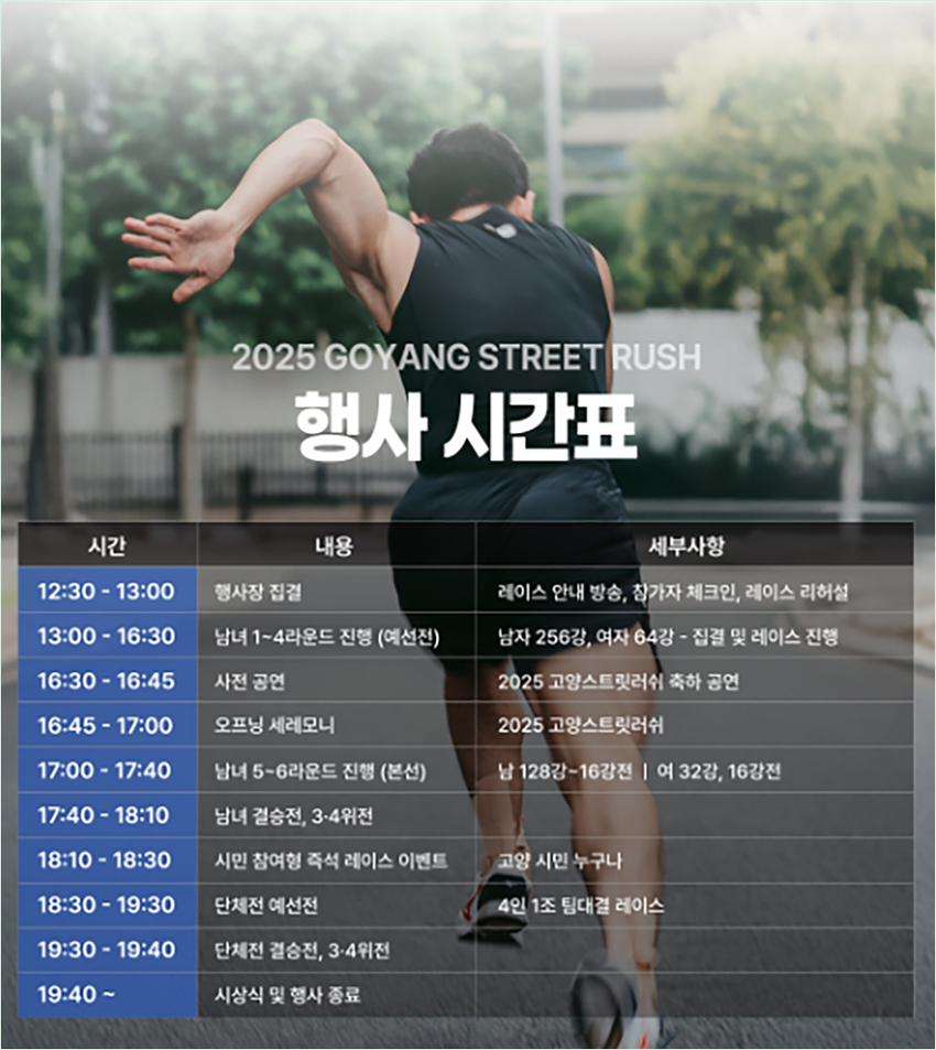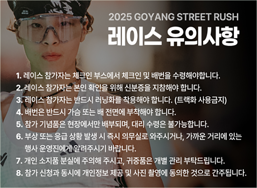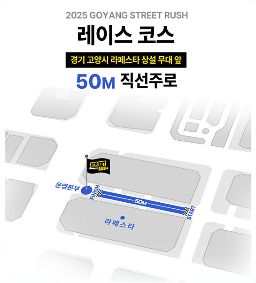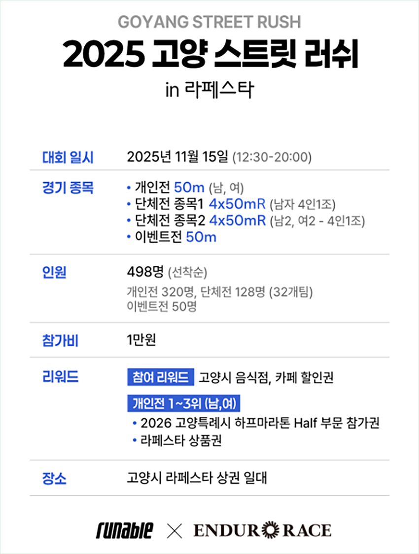 2025 고양 스트릿 러쉬는 순수한 스피드 하나로 승부하는 짧고 강렬한 레이스예요. 긴 코스에서 앞사람 때문에 답답했던 경험, 이제 없습니다.오직 여러분의 폭발적인 순간 가속만이 승부를 가르죠. 게다가 참가비 1만 원으로 음식점 할인권, 라페스타 상품권, 하프마라톤 참가권까지 받을 수 있다니! 11월 15일, 라페스타에서 펼쳐질 스피드 축제로 여러분을 초대합니다.