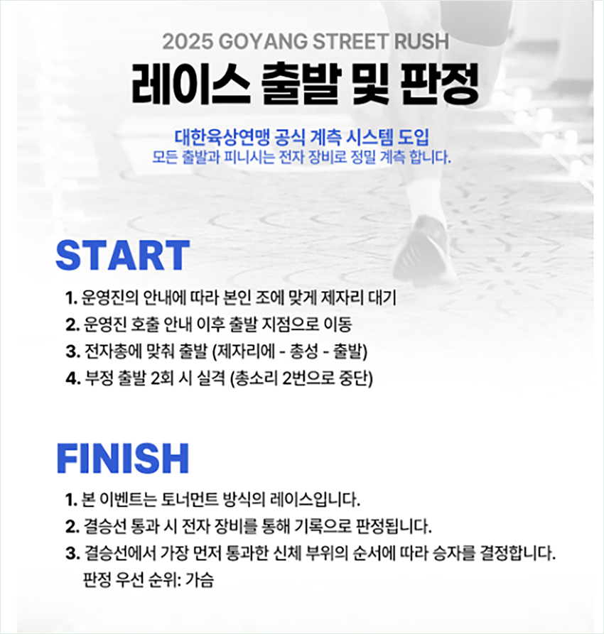 다만 바닥이 보도블럭이기 때문에 미끄러질 수 있으니, 접지력이 좋은 러닝화를 착용하는 것이 중요합니다. 트랙화는 착용이 불가하니 이 점 꼭 기억해 주세요!5️⃣ 경기 규칙 안내