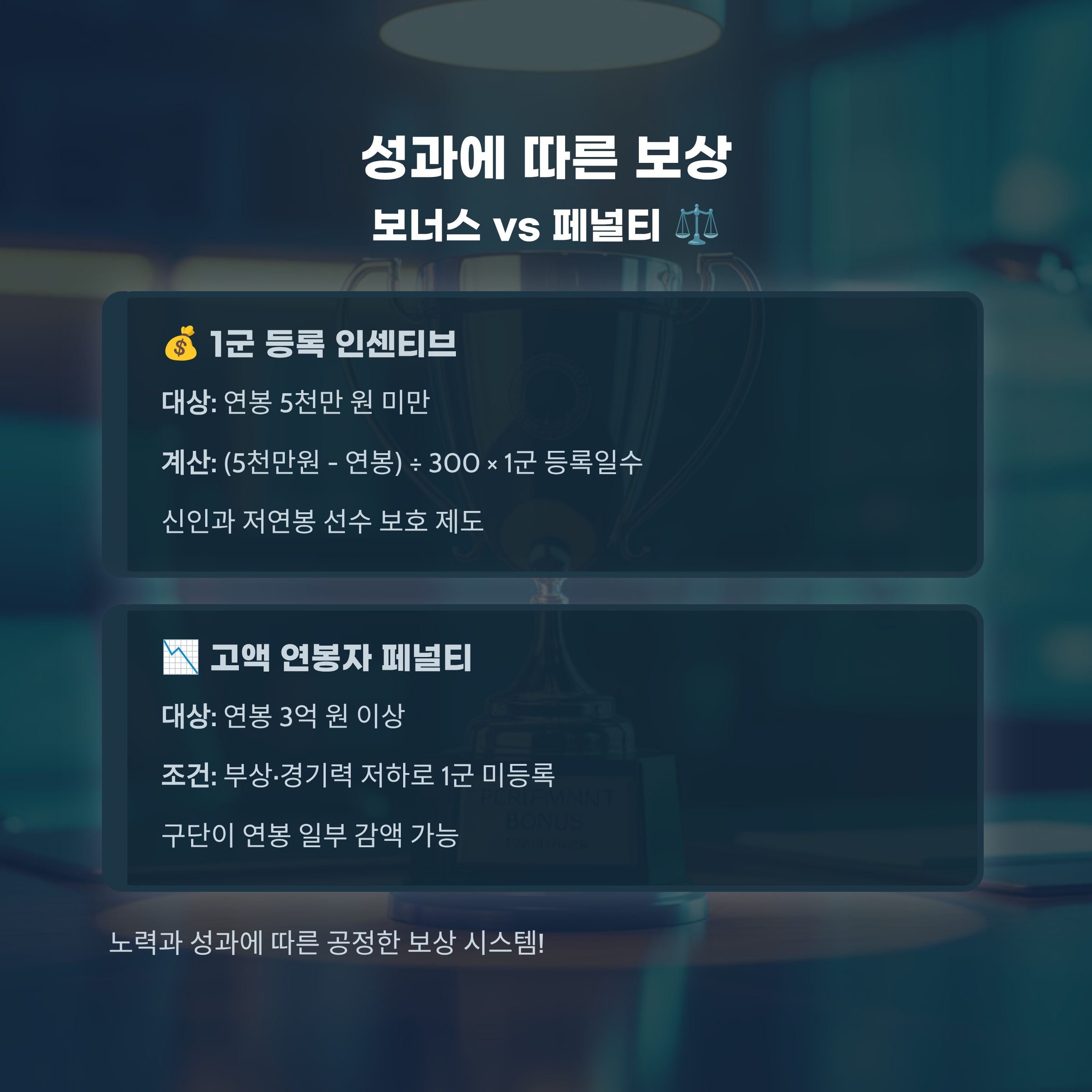 반대로 고액 연봉자를 위한 규정도 있어요.연봉 3억 원 이상의 선수가 부상이나 경기력 저하로 1군에 제대로 등록되지 못하면, 구단은 규정에 따라 연봉 일부를 감액할 수 있답니다. 높은 연봉에는 그만큼의 책임도 따르는 거예요.