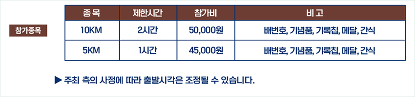10km 코스는 50,000원, 5km 코스는 45,000원이에요. 언뜻 보면 조금 비싸다고 느낄 수 있지만, 기록칩 제공, 여러 급수대 운영, 대회 후 떡국 제공 등을 생각하면 합리적인 수준이라고 할 수 있어요.