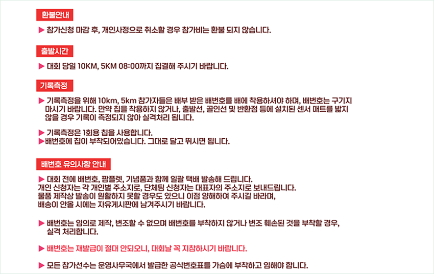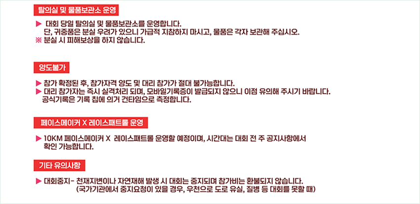 모든 러닝 대회가 그렇듯, 몇 가지 주의사항이 있어요.