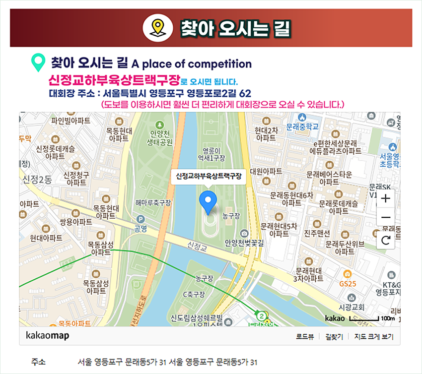 대회 장소인 신정교 하부 육상트랙구장은 접근성이 꽤 좋은 편이에요.