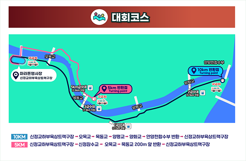 10km 코스는 안양천합수부까지 달린 후 되돌아오는 방식이고, 5km 코스는 목동교 근처에서 반환점을 돌아오게 돼요. 안양천은 평소에도 시민들이 자주 찾는 러닝 코스라서 길이 잘 정비되어 있고, 초보자도 충분히 완주할 수 있을 만큼 난이도가 높지 않아요.