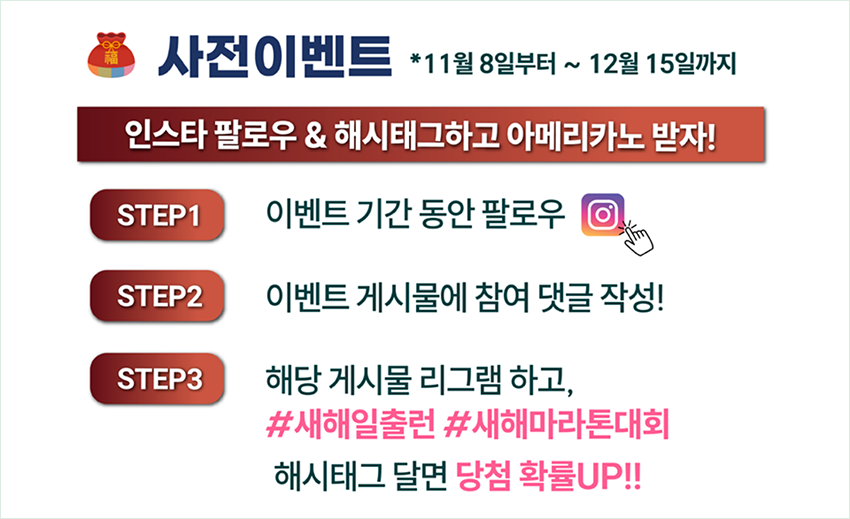 사전 이벤트로 대회 계정을 팔로우하고 해시태그와 함께 게시물을 올리면 아메리카노를 증정한다고 해요. 대회 후기 이벤트도 있는데, 대회 당일 붉은 말 아이템과 함께 인증샷을 찍어 인스타그램이나 블로그에 올리면 치킨을 준다고 하니 꼭 도전해보세요!