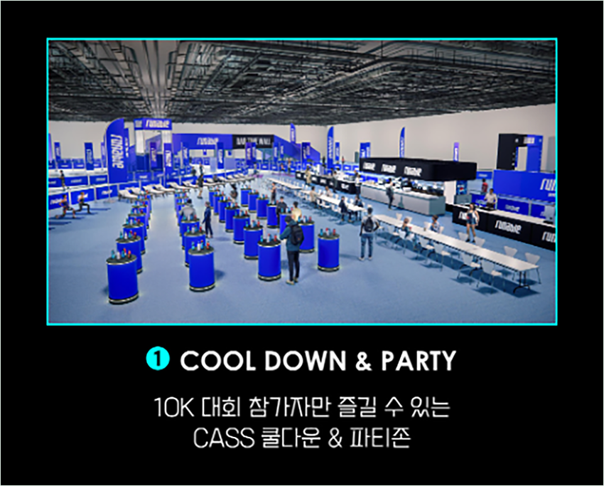 먼저 스폰서인 CASS가 운영하는 '쿨다운 & 파티존'에서는 무알콜 맥주와 함께 음악을 즐기며 휴식을 취할 수 있어요. 달리기 후 땀을 식히면서 축제 분위기를 만끽하기에 딱 좋은 공간이죠.