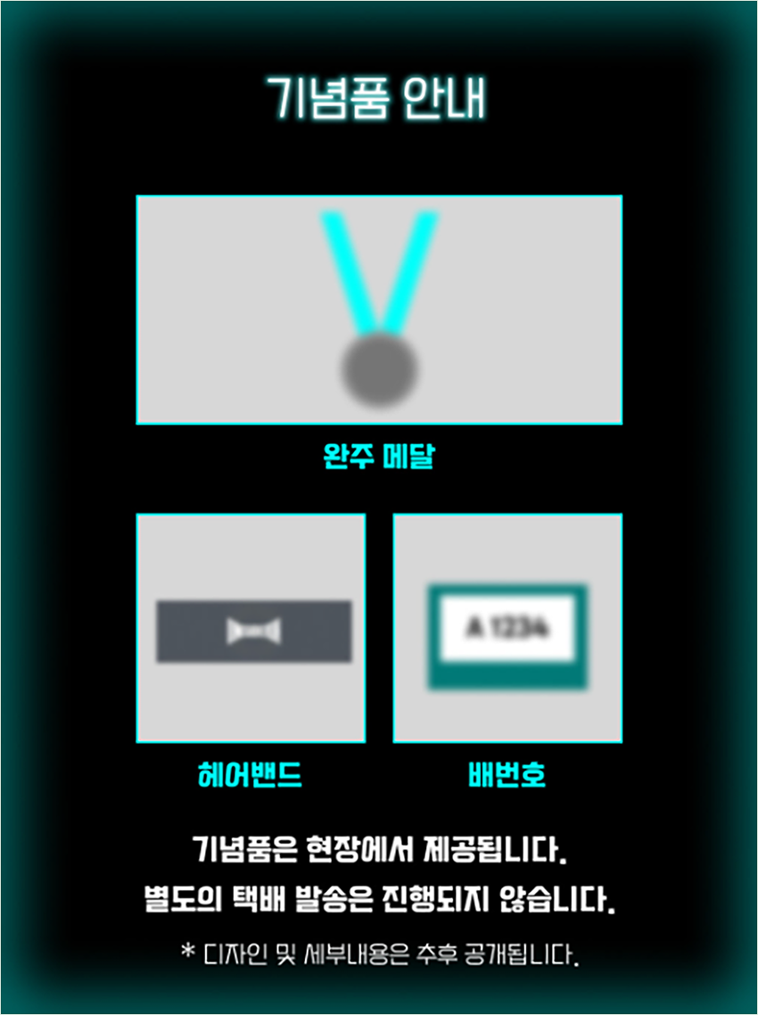 대회에 참가하면 완주 메달, 헤어밴드, 배번호를 받을 수 있어요. 모든 기념품은 현장에서만 수령 가능하고, 불참할 경우 택배 발송 서비스는 제공되지 않으니 이 점 꼭 기억하세요.