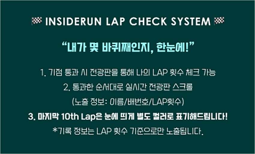 특히 초보 러너들에게 좋은 환경이에요. 각 바퀴마다 설치된 랩 카운트 전광판에는 참가자의 이름과 배번호, 그리고 남은 랩 수가 실시간으로 표시되거든요. 지금 몇 바퀴를 돌았는지 헷갈릴 일이 없고, 마지막 랩에는 전광판 색상이 바뀌어서 완주의 긴장감과 성취감을 더욱 생생하게 느낄 수 있어요.