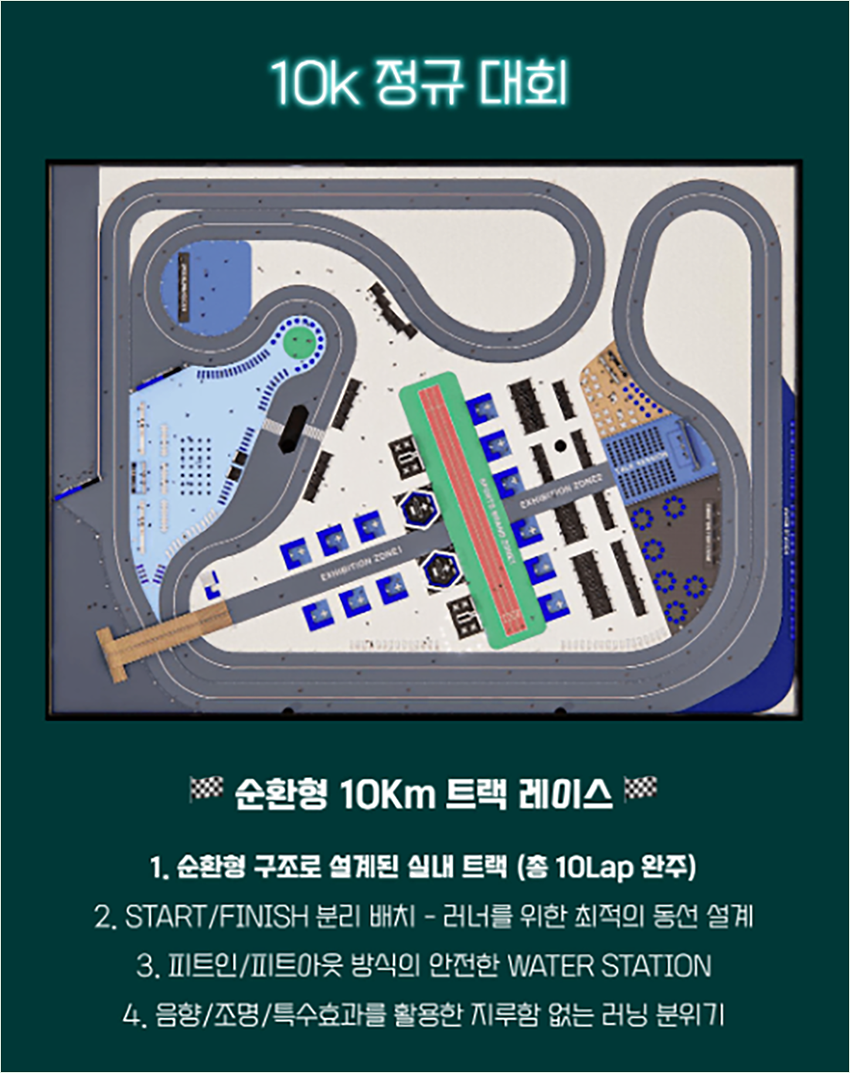 인사이드 런 W의 가장 큰 특징은 바로 실내 순환 트랙이에요. 킨텍스 내부에 특별히 조성된 1km 트랙을 10바퀴 도는 방식으로 10km를 완주하게 되는데요, 야외 코스와 달리 바람이나 기온 변화가 없어서 일정한 페이스를 유지하기가 훨씬 수월해요.