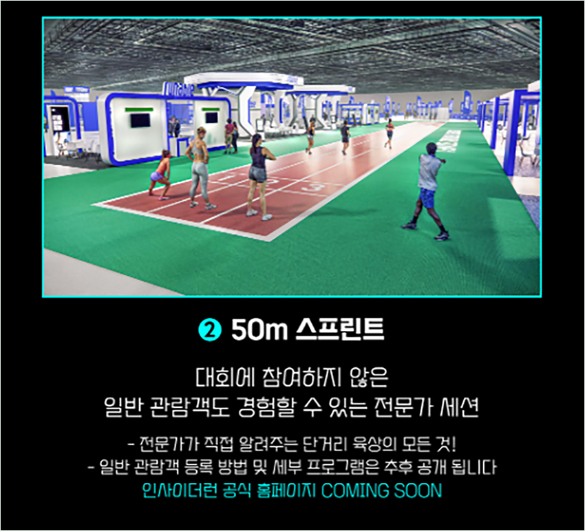 참가자가 아니어도 체험 가능한 '50m 스프린트 체험'도 준비되어 있어요. 전문 코치에게 단거리 육상 동작을 배우고 직접 달려볼 수 있는 프로그램으로, 어린이나 러닝에 관심 있는 분들에게 인기가 많을 것 같아요.