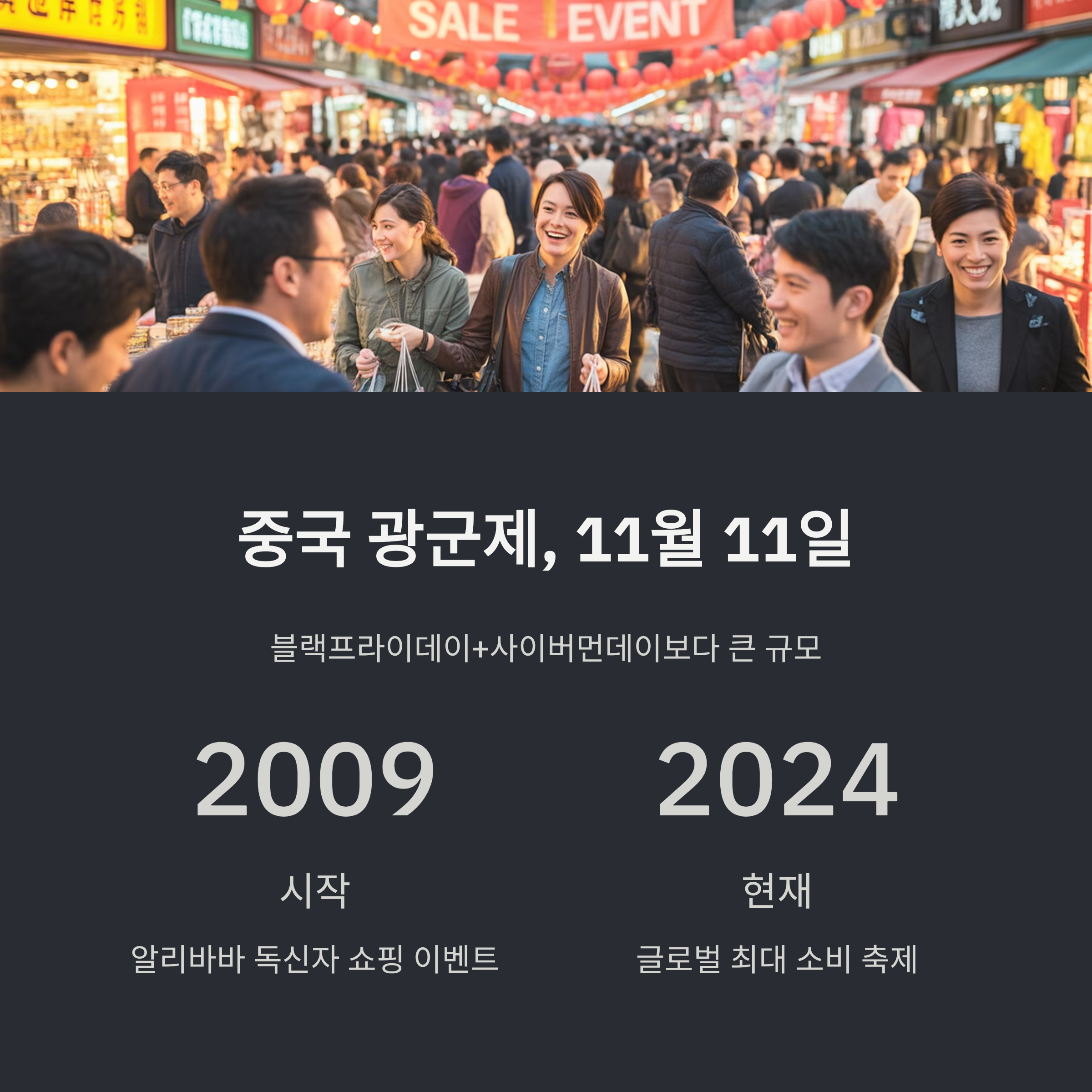 11월 11일은 중국에서 일 년 중 가장 큰 쇼핑 축제인 광군제가 열리는 날입니다.알리바바가 2009년 독신자들을 위한 쇼핑 이벤트로 시작했지만, 지금은 미국의 블랙프라이데이와 사이버먼데이를 합친 것보다 더 큰 규모의 글로벌 소비 행사로 자리 잡았습니다.