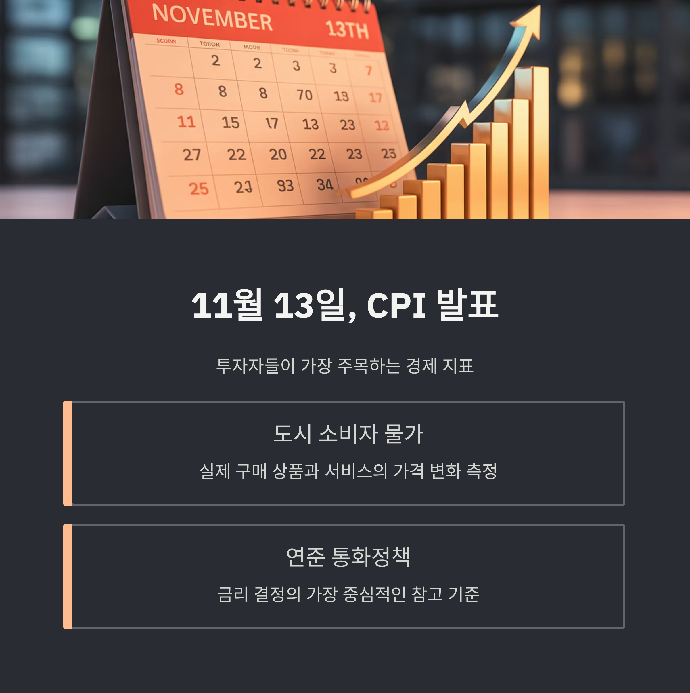 11월 13일 목요일에 발표되는 10월 소비자물가지수는 투자자들이 가장 주목하는 지표입니다.이 지표는 도시 거주 소비자들이 실제로 구매하는 상품과 서비스의 가격 변화를 측정하는 것으로, 연방준비제도가 통화정책을 결정할 때 가장 중심적으로 참고하는 기준이 됩니다.