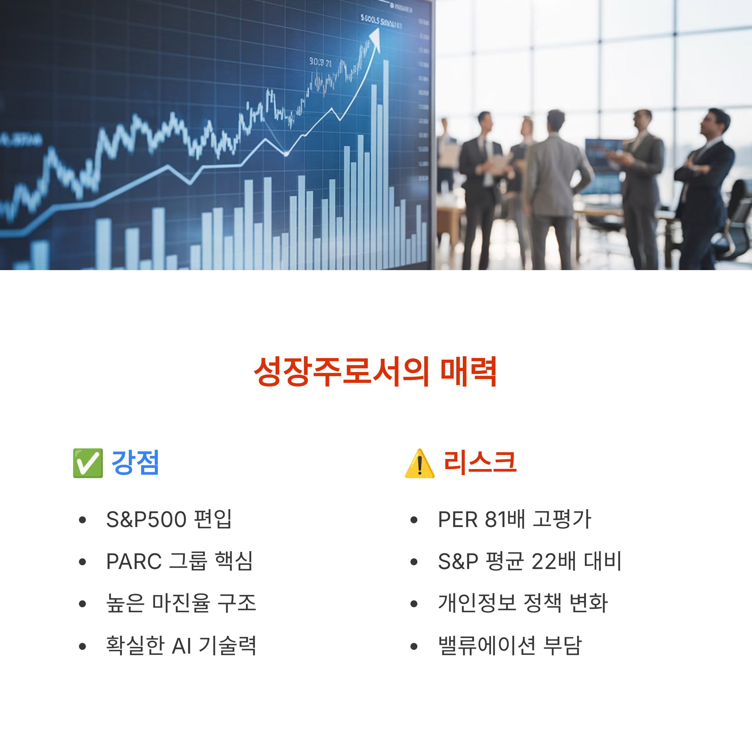 현재 PER은 약 81배로, S&P500 평균(22배)을 크게 웃돌고 있습니다. 또한 애플·구글의 개인정보 정책 변화는 여전히 리스크 요인으로 남아 있습니다.