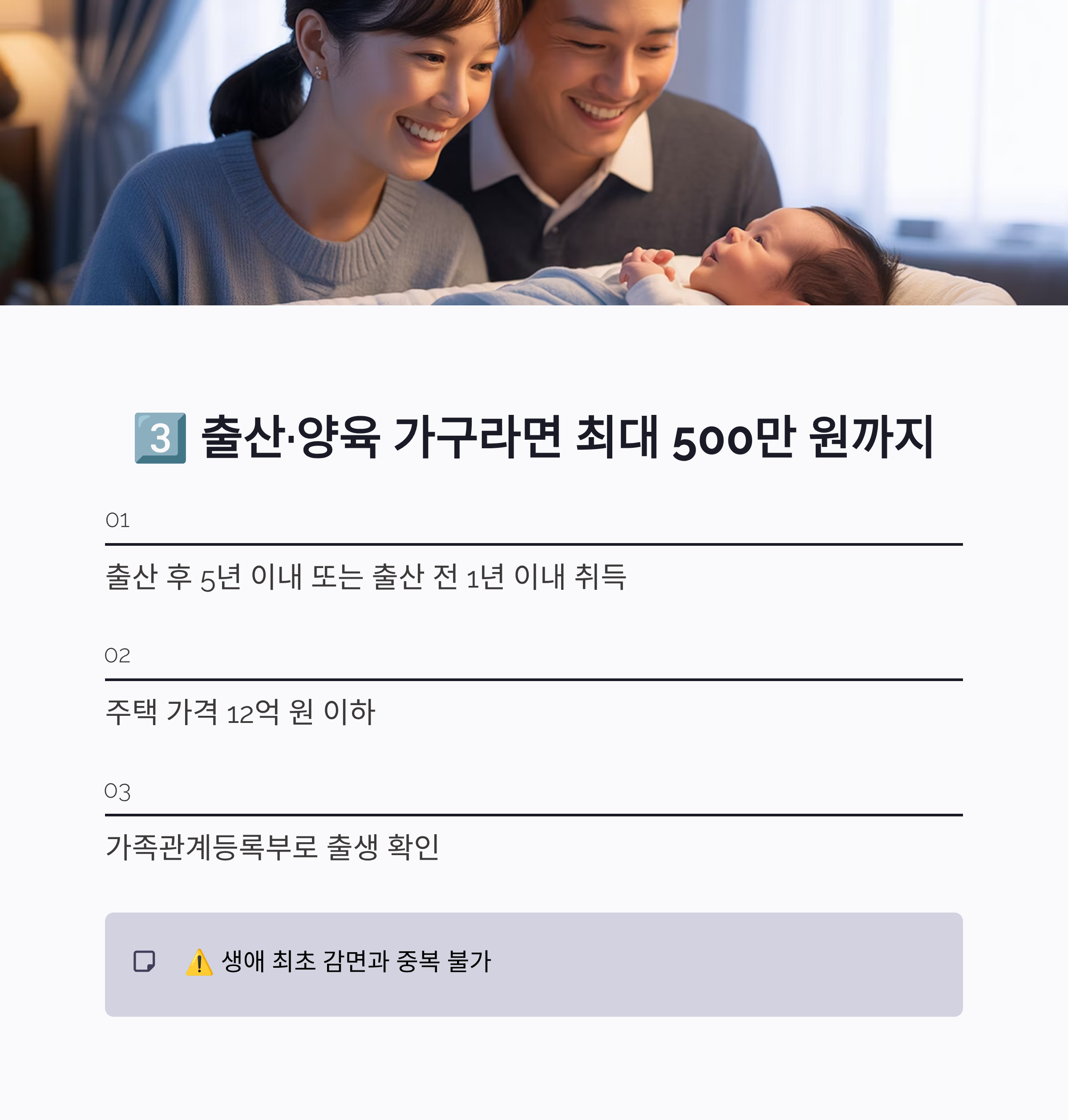 이처럼 감면액은 주택의 종류, 위치, 금액에 따라 달라지므로 계약 전 시청이나 구청 세무과에서 감면 대상 여부를 확인하는 것이 안전합니다.3️⃣ 출산·양육 가구라면 최대 500만 원까지