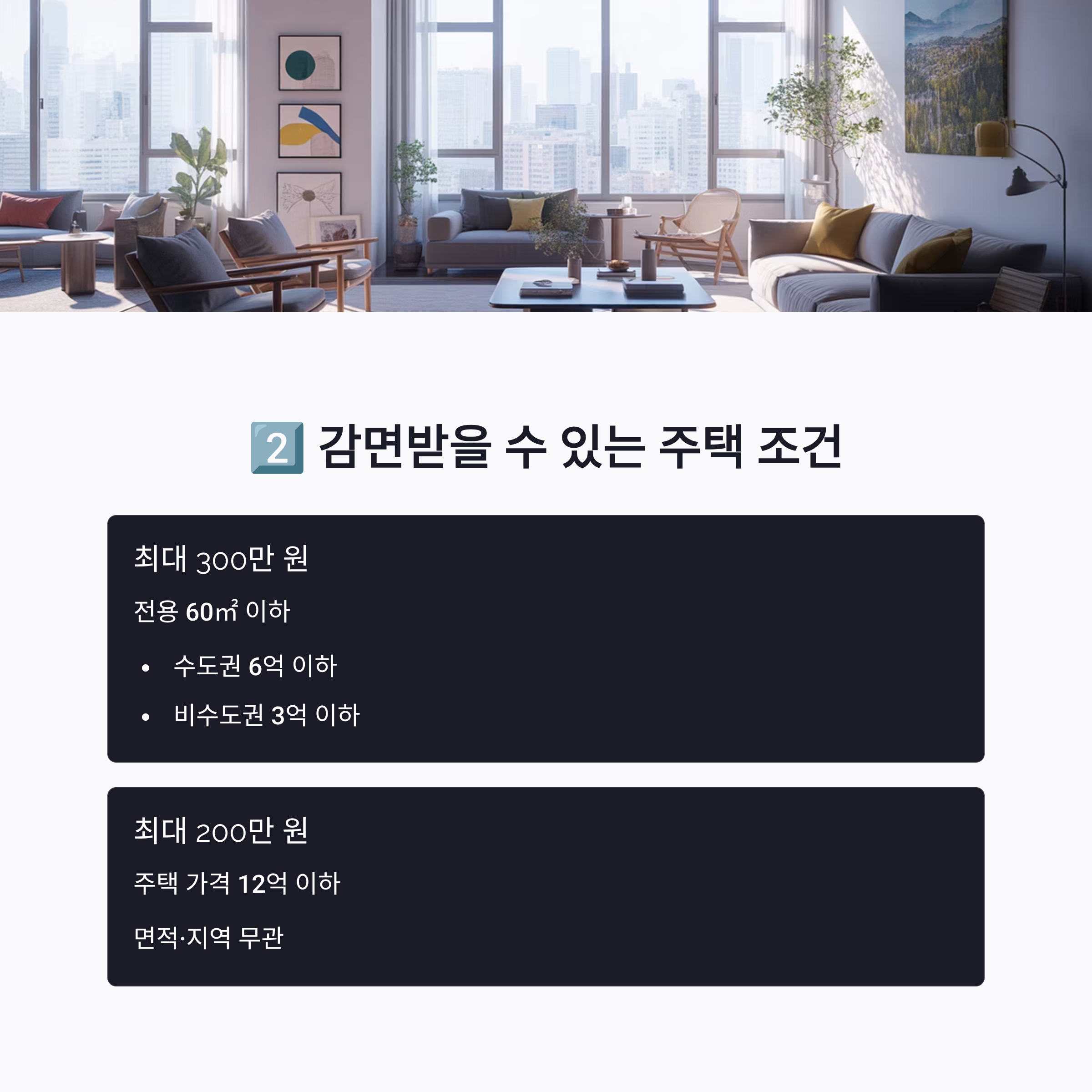 최대 200만 원 감면 대상 주택 가격이 12억 원 이하일 경우 받을 수 있는 감면입니다. 다만, 면적이나 지역 조건을 충족하지 않아도 일정 부분 감면이 가능하니 자신이 어느 구간에 해당하는지 꼭 확인해야 합니다.