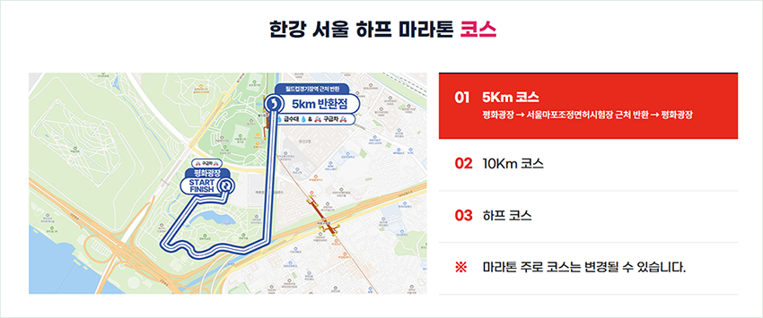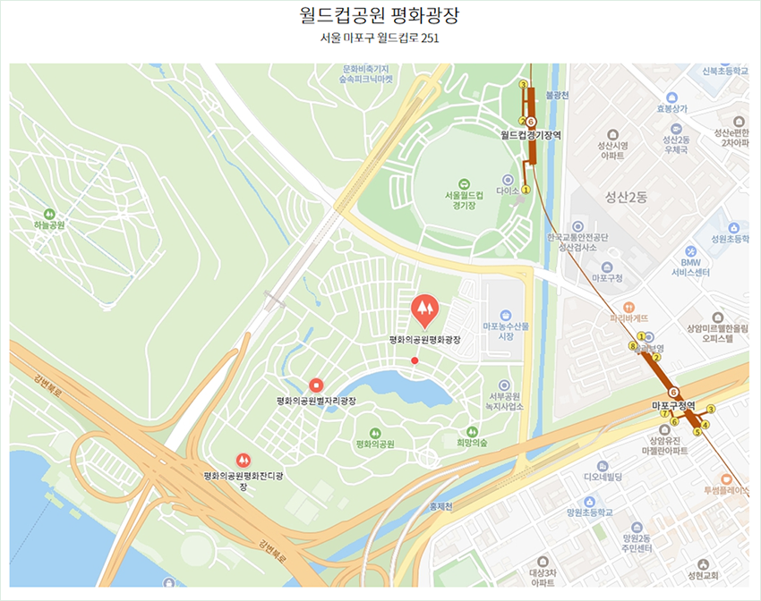 출발 장소는 마포구 월드컵로 251에 위치한 평화의공원 평화광장이에요. JTBC 서울 마라톤 등 큰 대회들이 자주 열리는 곳이라 시설이 잘 갖춰져 있고, 지하철역과도 가까워서 찾아가기 편리하답니다.