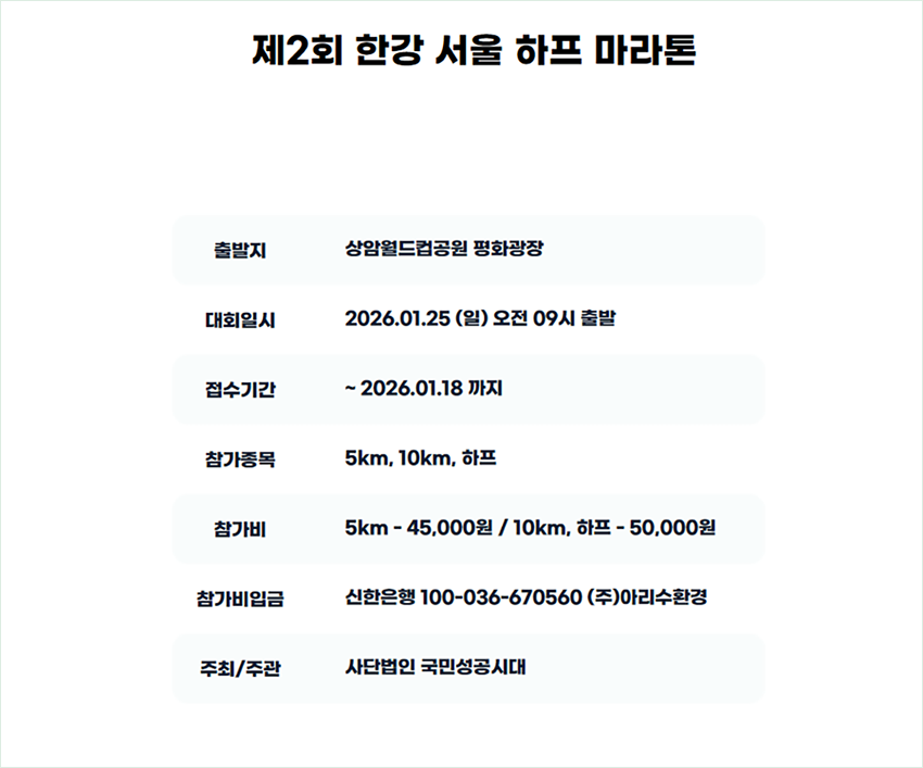 작년 첫 대회가 5월에 열렸는데, 올해는 한겨울로 바뀌어서 놀라신 분들이 많을 거예요. 하지만 새해 첫 마라톤으로 한 해를 힘차게 시작하고 싶은 러너들에게는 오히려 완벽한 타이밍이에요!2. 참가 종목과 비용