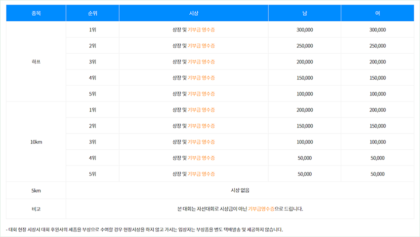 이번 대회의 가장 특별한 점은 바로 기부형 시상 방식이에요. 일반 마라톤 대회처럼 현금 상금을 주는 대신, 시상금 전액을 기부금으로 전환해서 기부금 영수증으로 수여해요. 최고 시상금은 30만 원 상당이에요.
