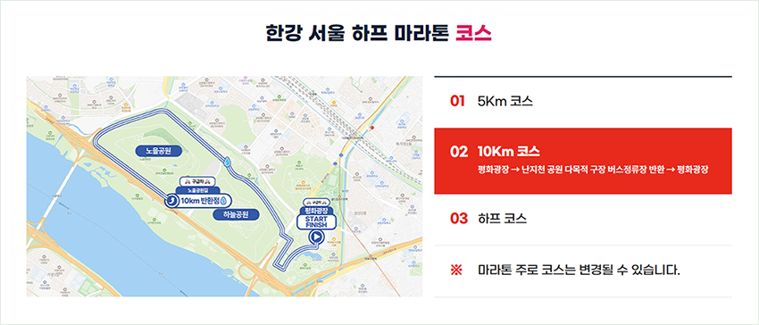 하프 마라톤과 10km 코스는 참가비가 5만 원이에요. 두 종목 모두 기록칩이 제공되어 정확한 기록 측정이 가능하고, 넷타임으로 측정된답니다. 자신의 기록을 남기고 싶거나 실력을 확인하고 싶다면 이 두 종목 중 하나를 선택하면 돼요.