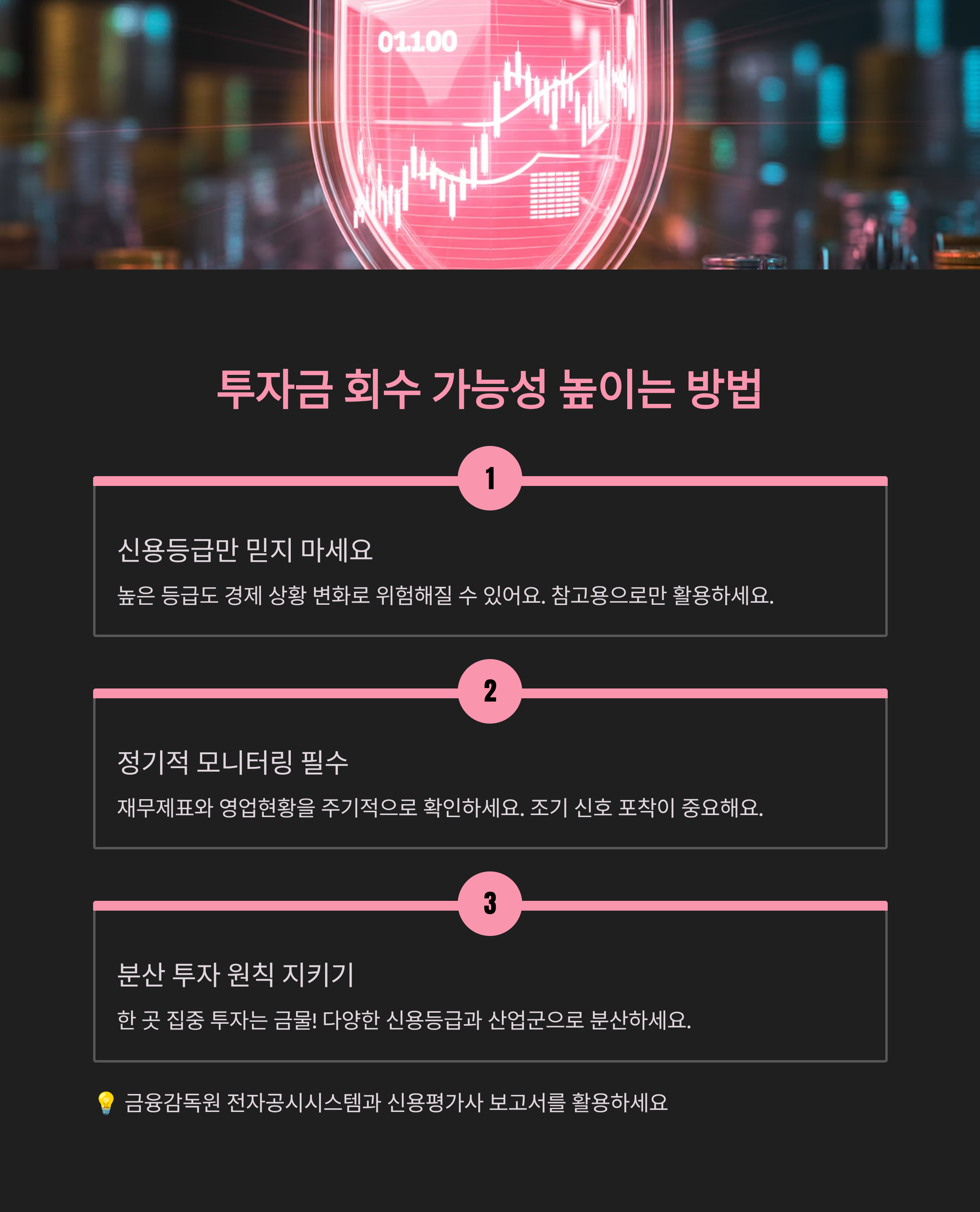 둘째, 투자한 기업의 재무제표와 영업 현황을 주기적으로 확인하세요. 금융감독원 전자공시시스템이나 신용평가사 보고서를 통해 최신 정보를 체크하는 습관을 들이세요. 조기에 위험 신호를 포착하면 손실을 줄일 수 있어요.