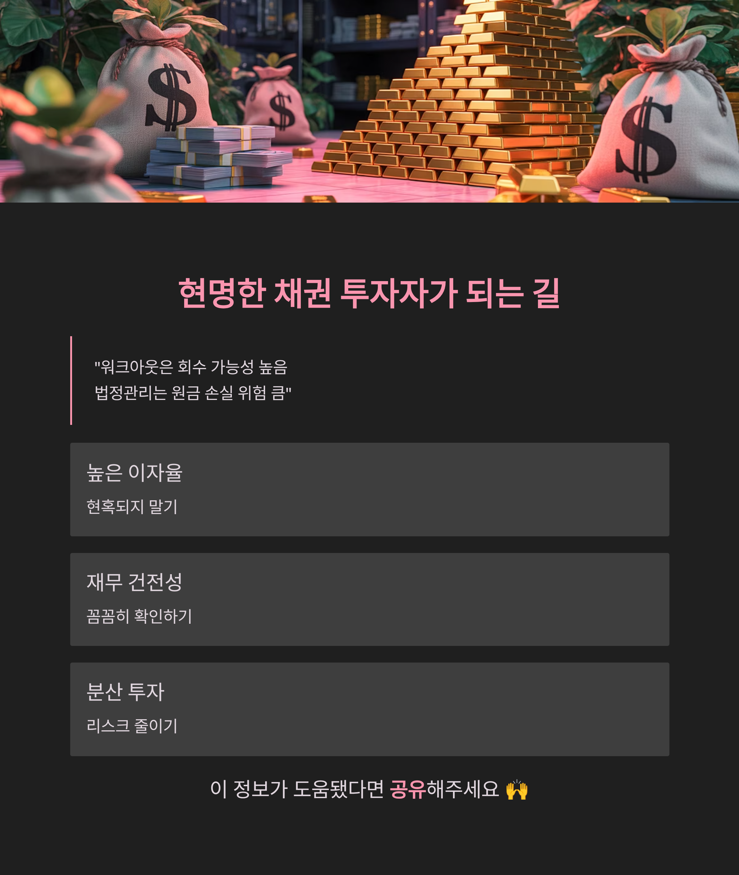 셋째, 절대 한 기업에만 집중 투자하지 마세요. 분산 투자는 채권 투자의 기본 원칙이에요. 신용등급이 다른 여러 기업, 서로 다른 산업군의 채권으로 나눠서 투자하면 한 곳이 부도 나더라도 전체 손실을 줄일 수 있어요.✅ 마무리하며