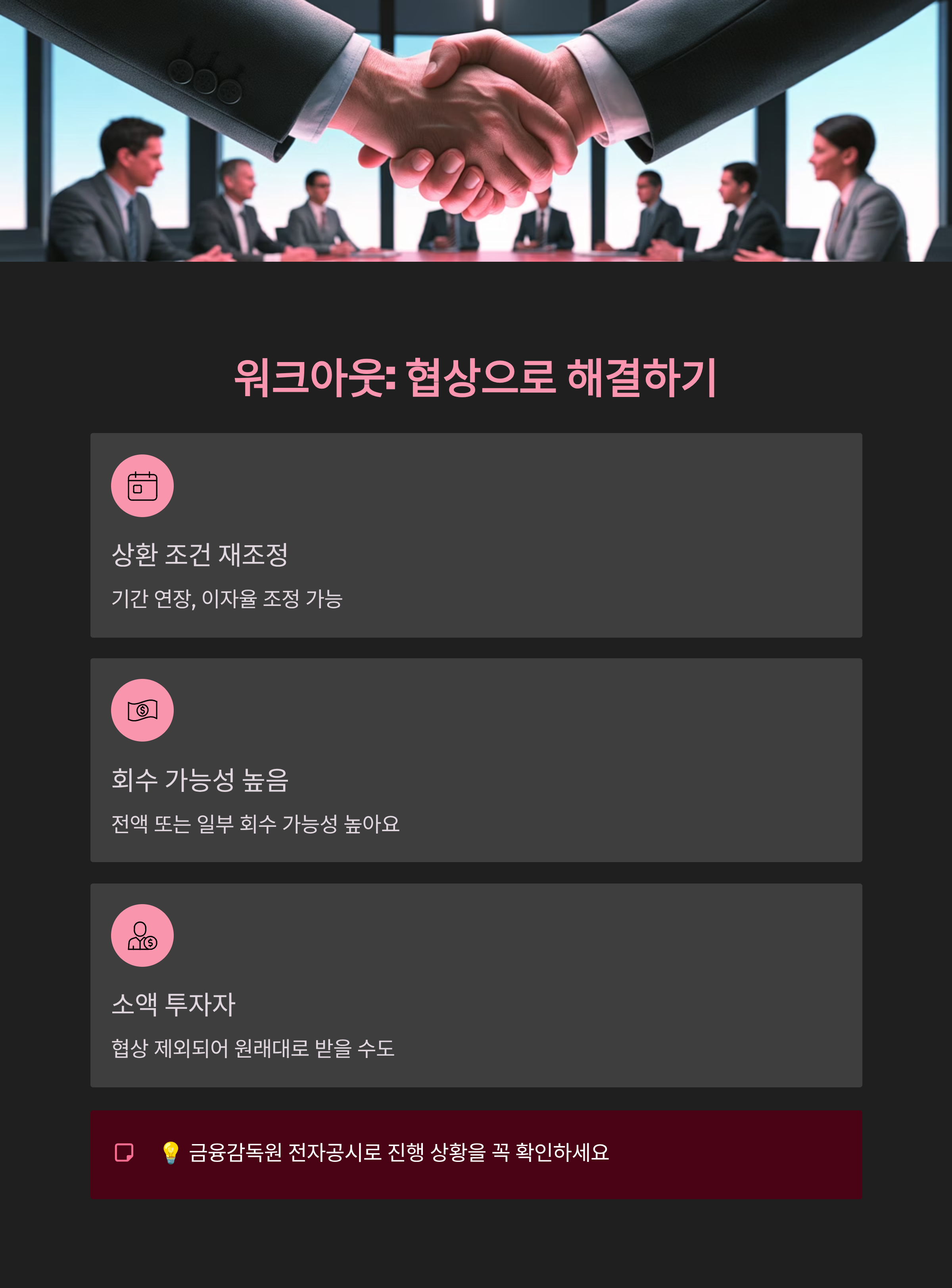 이때 좋은 소식은 워크아웃에 성공하면 투자금을 온전히 또는 일부만 조정해서 돌려받을 가능성이 높다는 점이에요. 상환 기간이 늘어나거나 이자율이 조정될 수는 있지만, 채권 투자금을 완전히 잃는 경우는 드물어요.