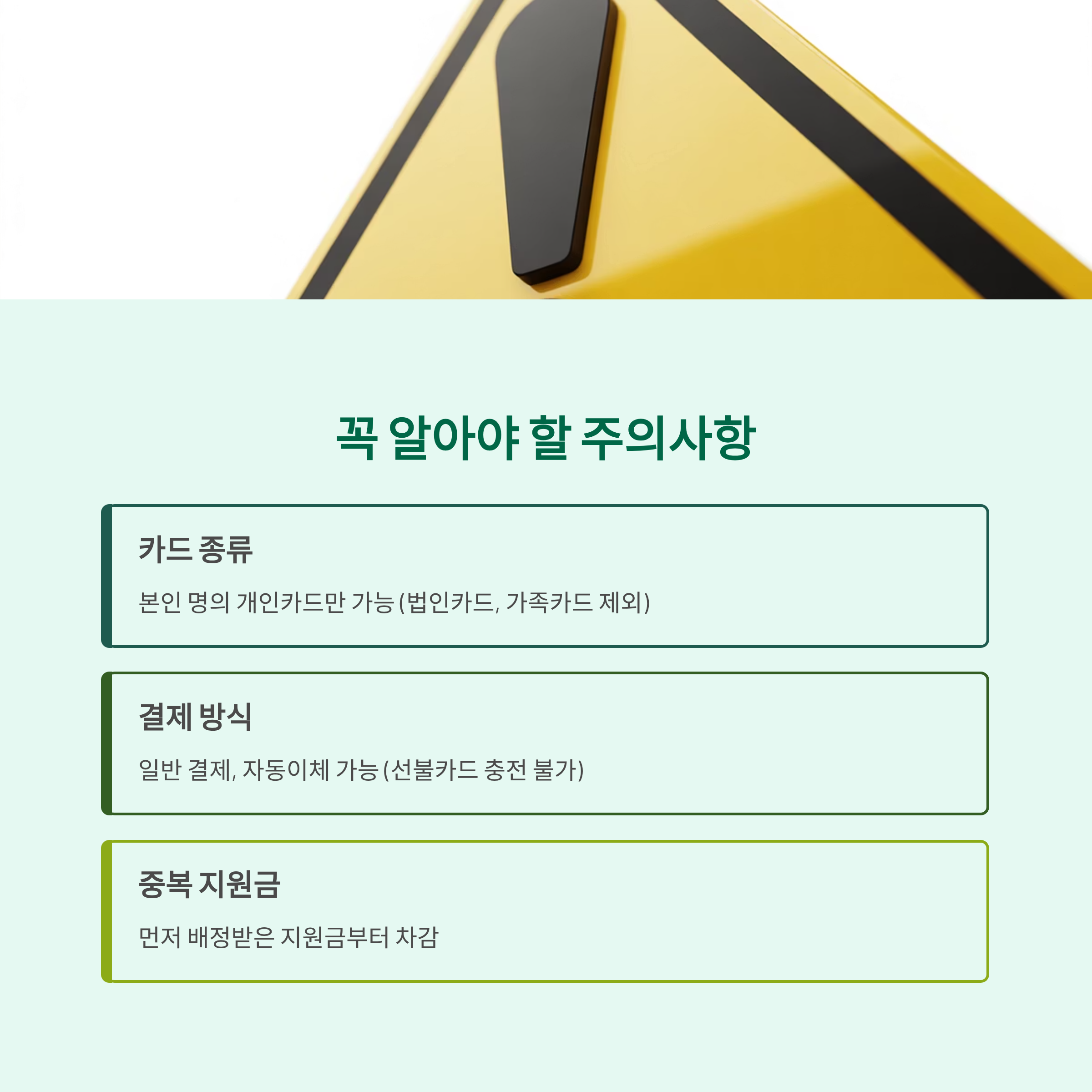 우선 카드 종류를 잘 확인하세요. 본인 명의 신용카드나 체크카드만 가능하고, 법인카드나 가족카드는 제외돼요. 신청 전에 카드가 본인 명의인지 꼭 확인하세요.