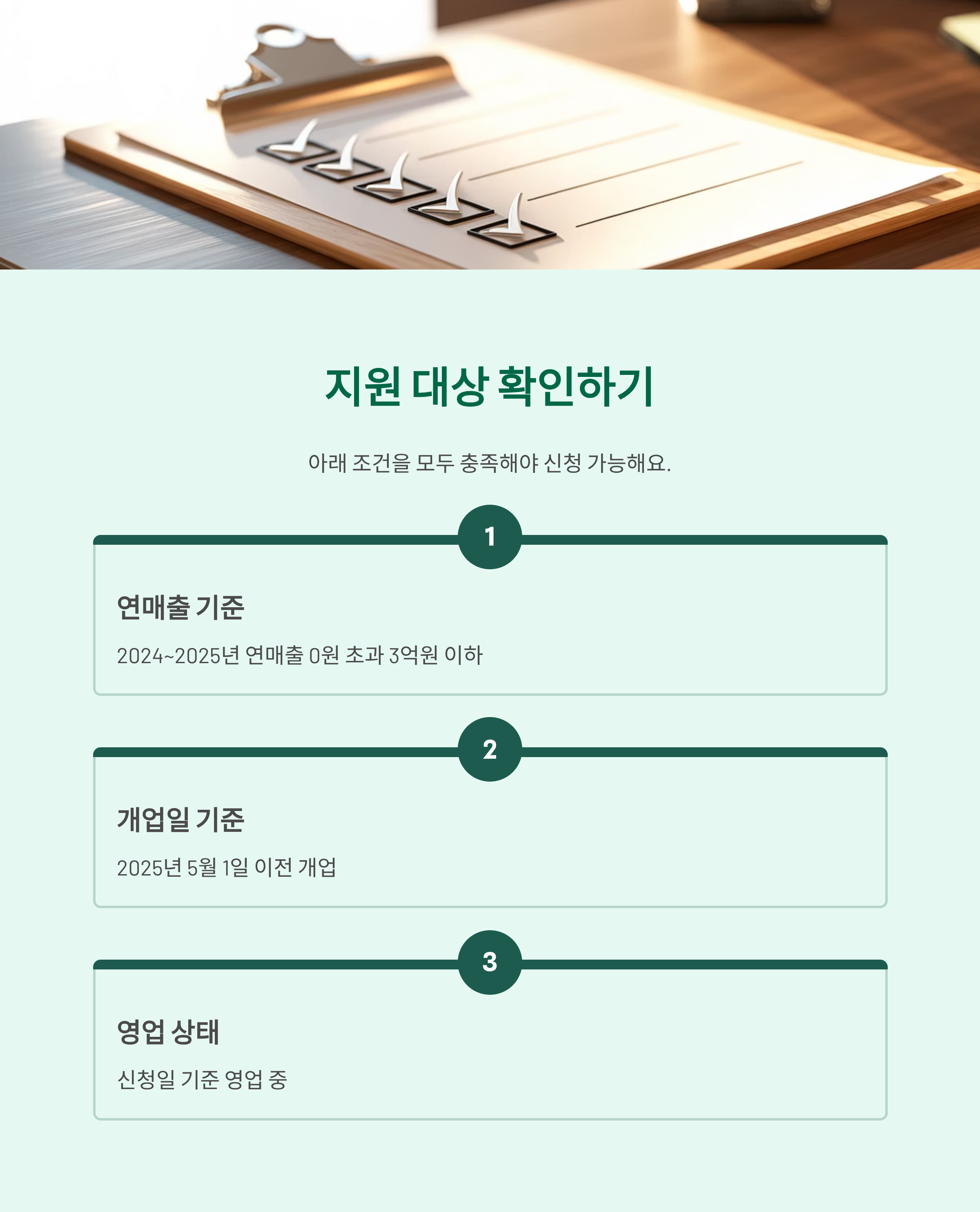 먼저 2024년 또는 2025년 연 매출이 0원 초과부터 3억원 이하여야 해요. 매출이 전혀 없거나 3억을 넘으면 대상이 아니에요. 그리고 개업일이 2025년 5월 1일 이전이어야 하고, 신청일 기준으로 영업 중인 상태여야 해요.