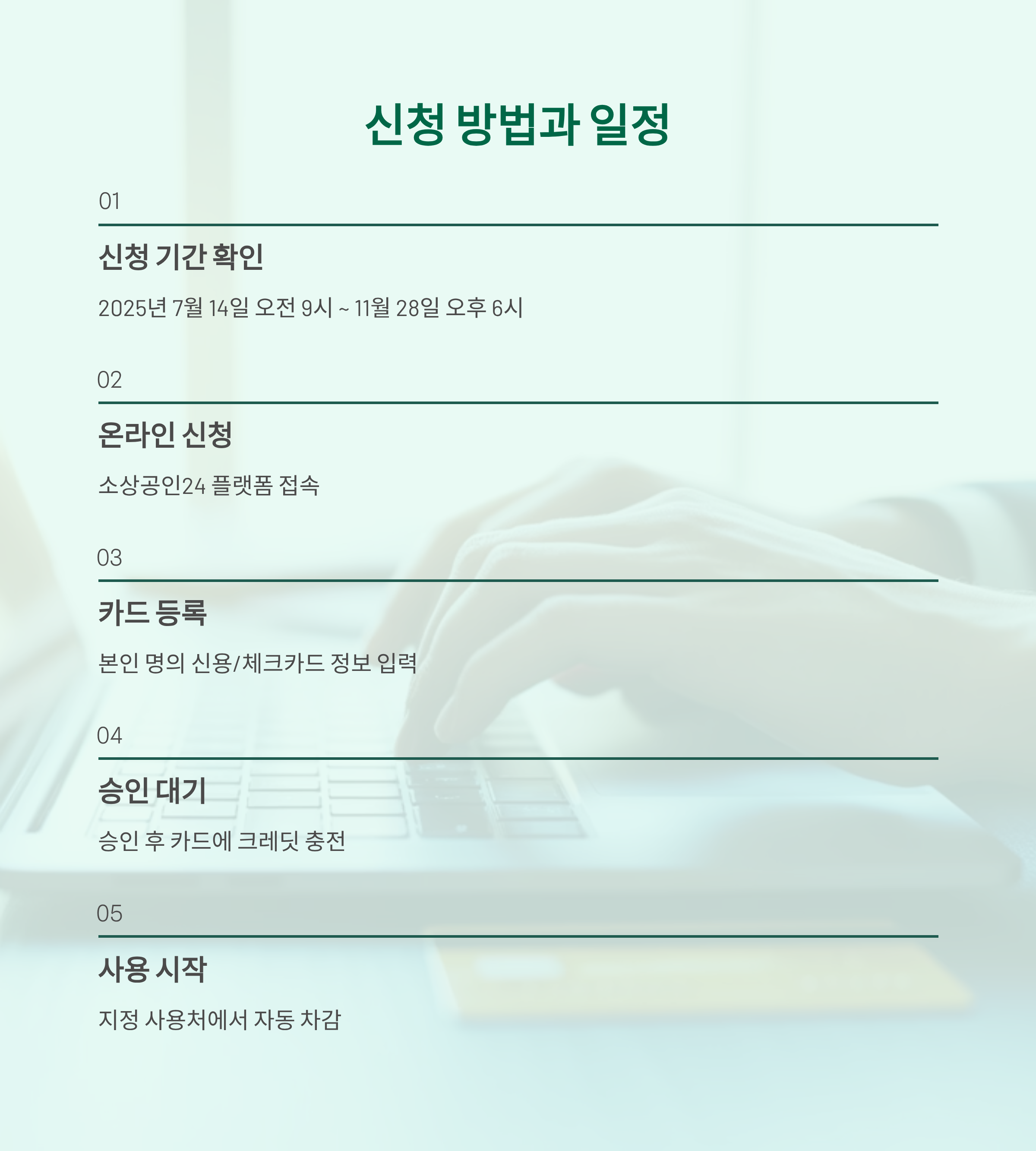 신청은 공식 사이트나 소상공인24 플랫폼을 통해 할 수 있어요. 본인 명의의 신용카드나 체크카드 정보를 등록하면 되는데, 법인카드나 가족카드는 안 돼요. 꼭 본인 명의 개인카드여야 해요.