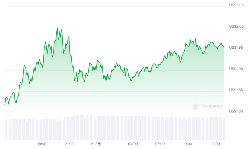 2025년 2월 20일 메인넷 출시 후 주요 거래소에 상장되면서 가격이 최고 2.99달러까지 상승했다가 현재 1.94달러 선에서 안정화되는 모습을 보이고 있습니다. 하지만 바이낸스 상장 가능성, 락업 해제 물량, 실물 경제 활용 확대 등이 앞으로의 가격 변동에 영향을 줄 수 있습니다.