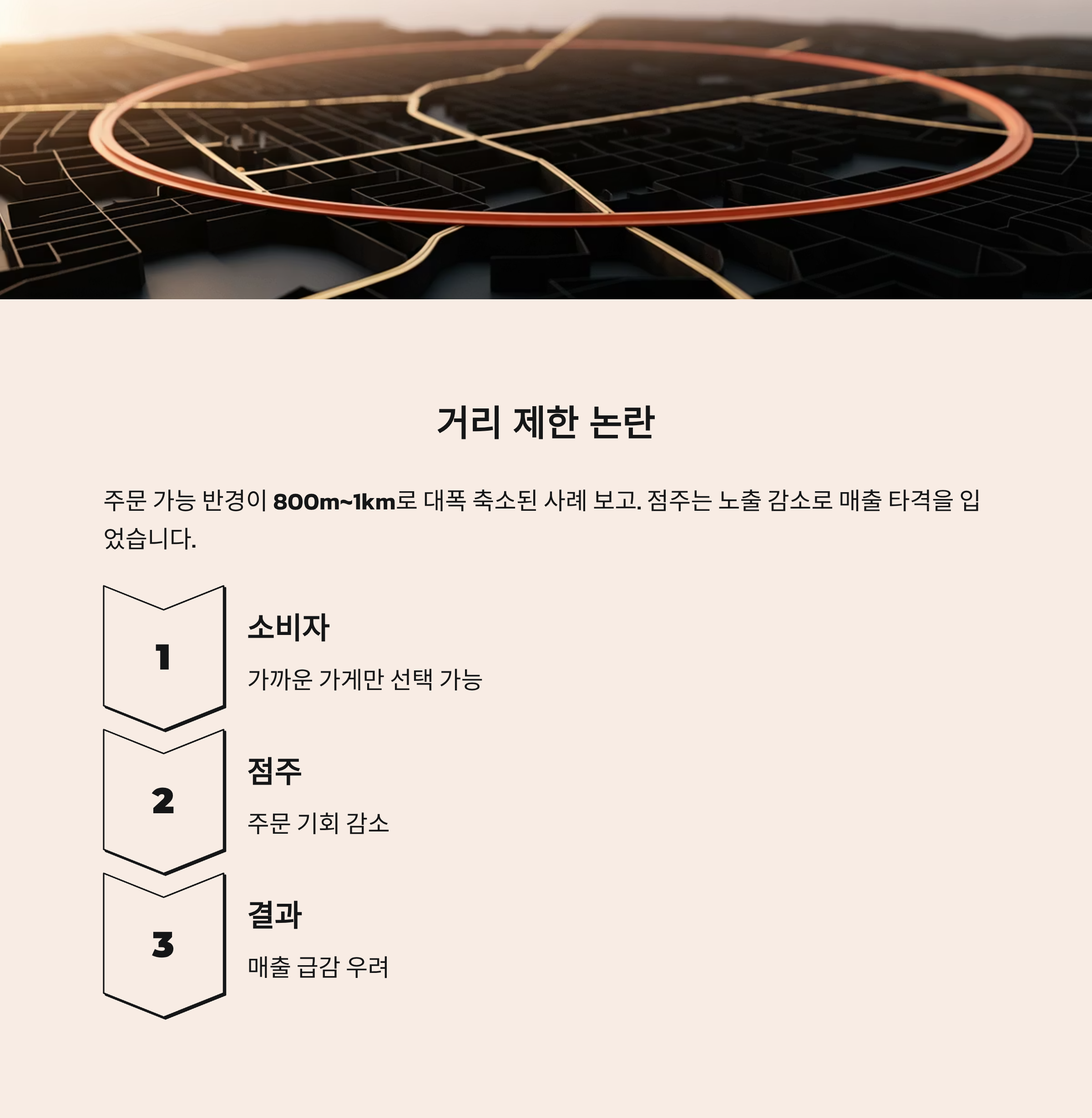 로드러너 도입 지역에서는 주문 거리 제한이 문제가 되고 있습니다.일부 보도에 따르면, 주문 가능한 반경이 기존 대비 매우 좁아졌고, 이로 인해 매출이 크게 감소한 점주가 있다는 주장도 나왔어요.