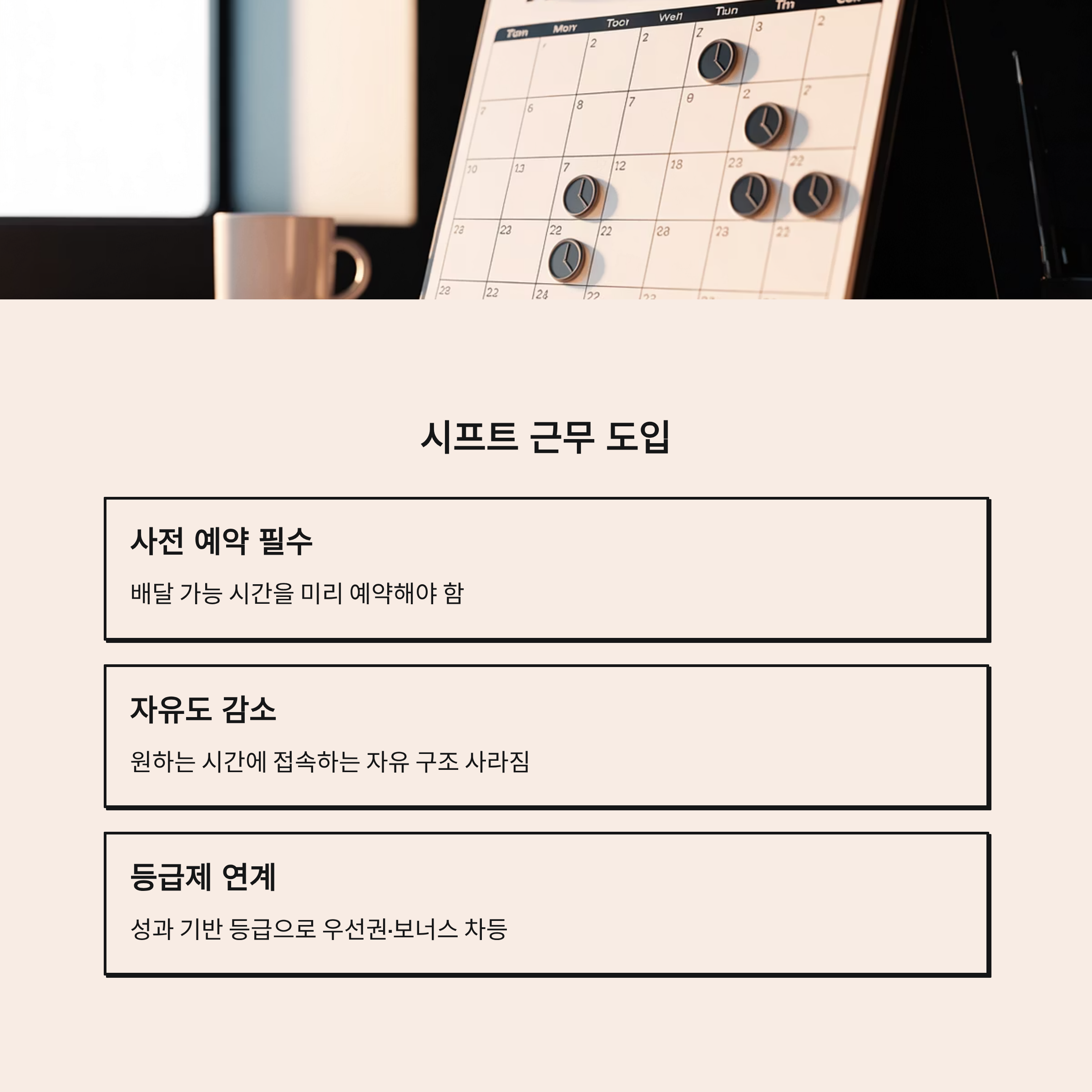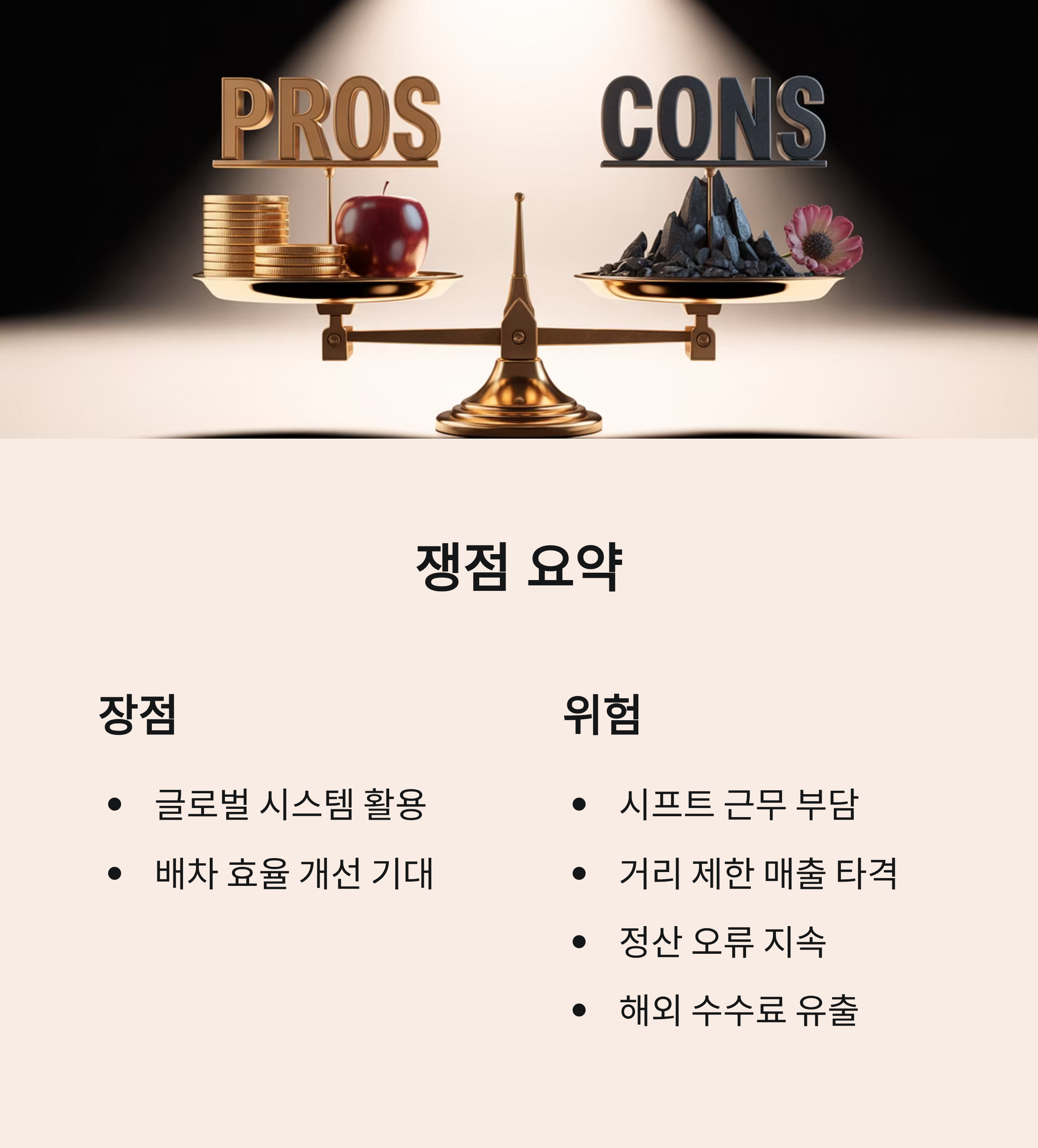 이 시스템, 왜 문제가 되는 걸까요? 시프트 근무, 거리 제한, 배차 불안정 등 다양한 지적이 나오고 있고, 일부는 해외 본사 수익 구조와 연결된 전략이라는 비판까지 있습니다.