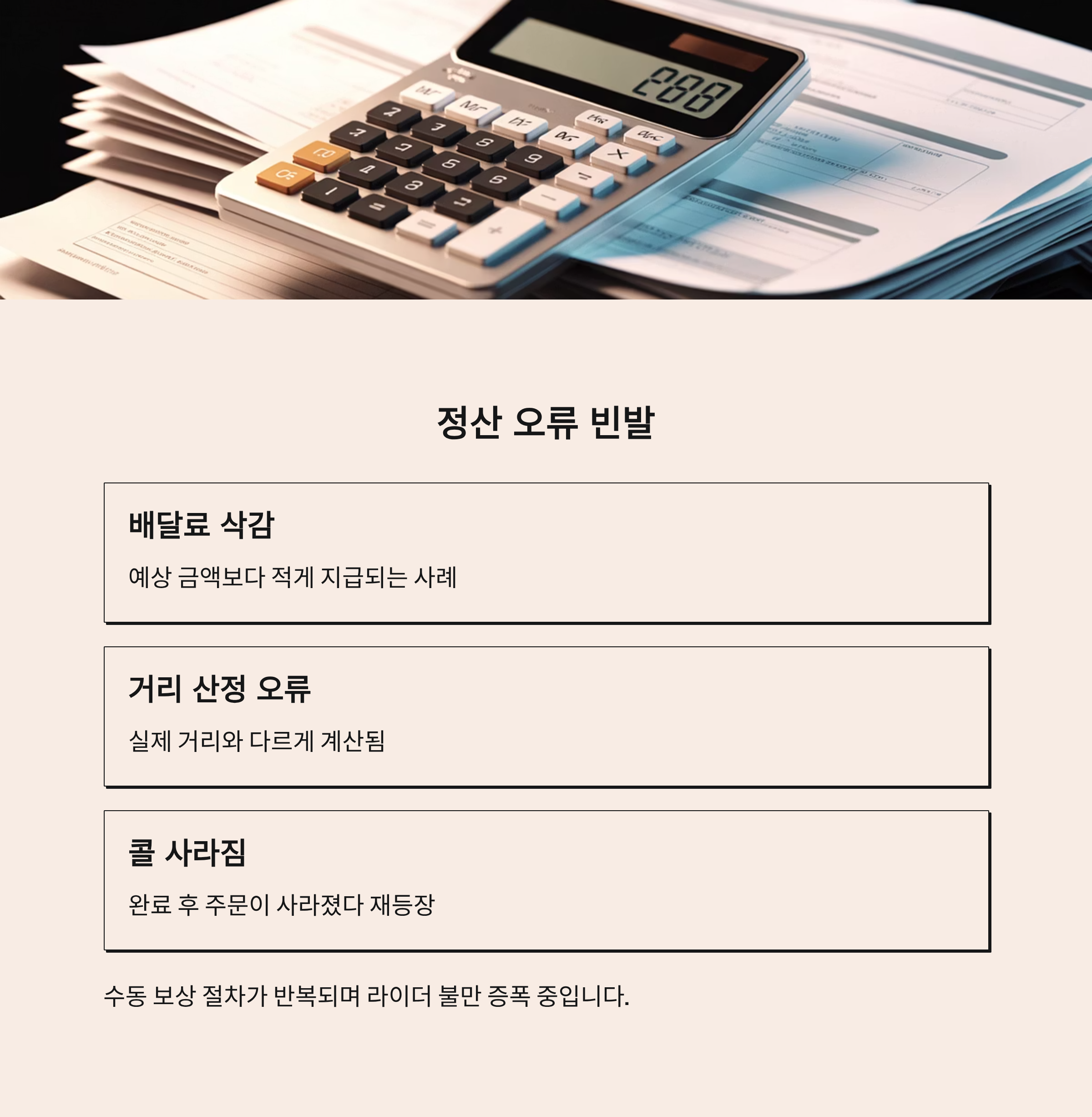 라이더 쪽에서는 정산 오류도 빈번하게 발생한다고 해요.일부는 배달료 삭감, 거리 산정 오류, 그리고 배달 완료 후 콜(주문)이 사라졌다가 나중에 다시 뜨는 문제까지 경험했다고 주장하고 있습니다.