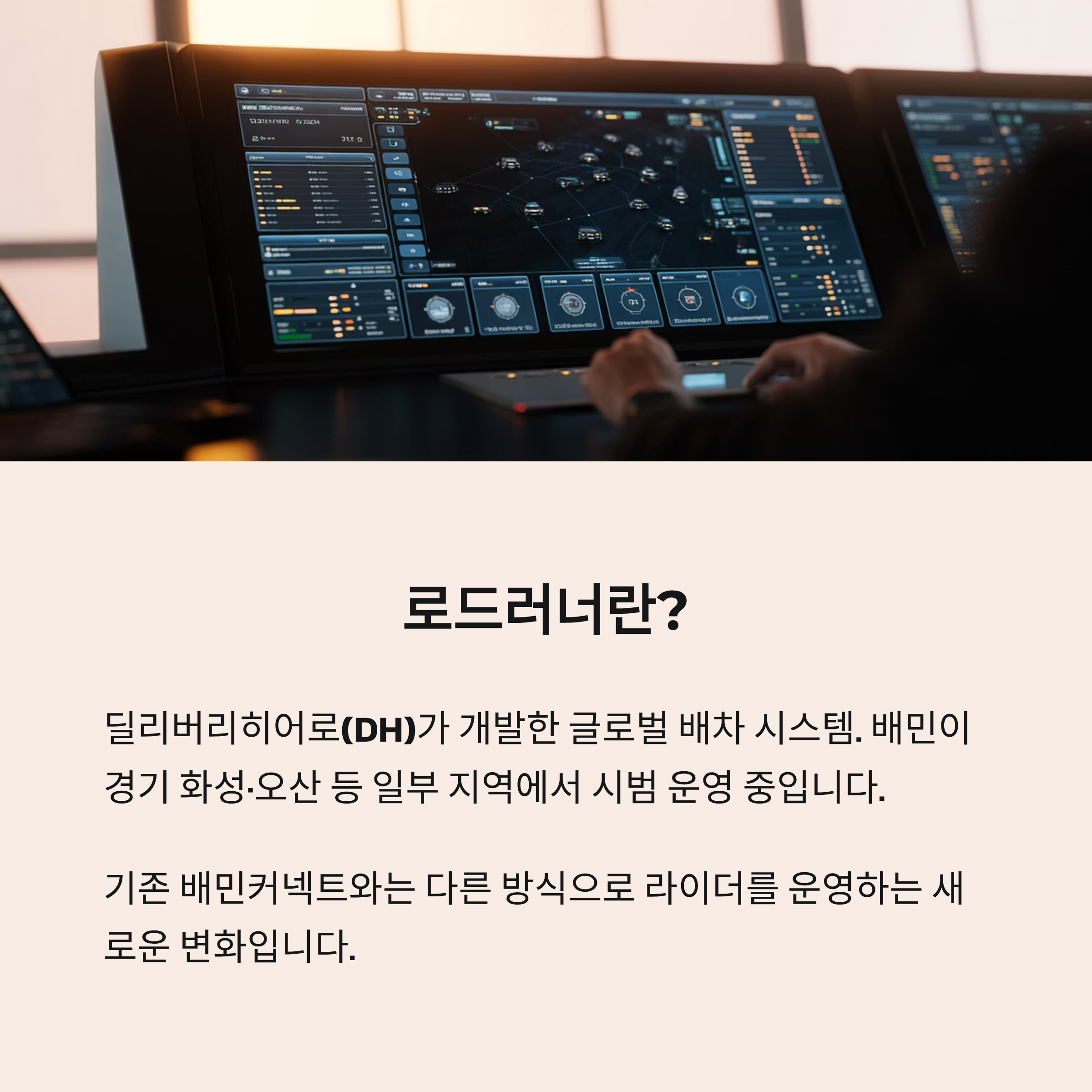 로드러너(Roadrunner)는 배민의 모회사 딜리버리히어로(DH)가 개발한 글로벌 배차 시스템이에요.현재 배민은 일부 지역(예: 경기 화성, 오산 등)에서 시범적으로 로드러너를 도입하고 있고요. (IT 전문 뉴스포털 전자신문) 기존의 배민커넥트 앱과는 다른 방식으로 라이더를 운영하려는 변화입니다. (IT 전문 뉴스포털 전자신문)