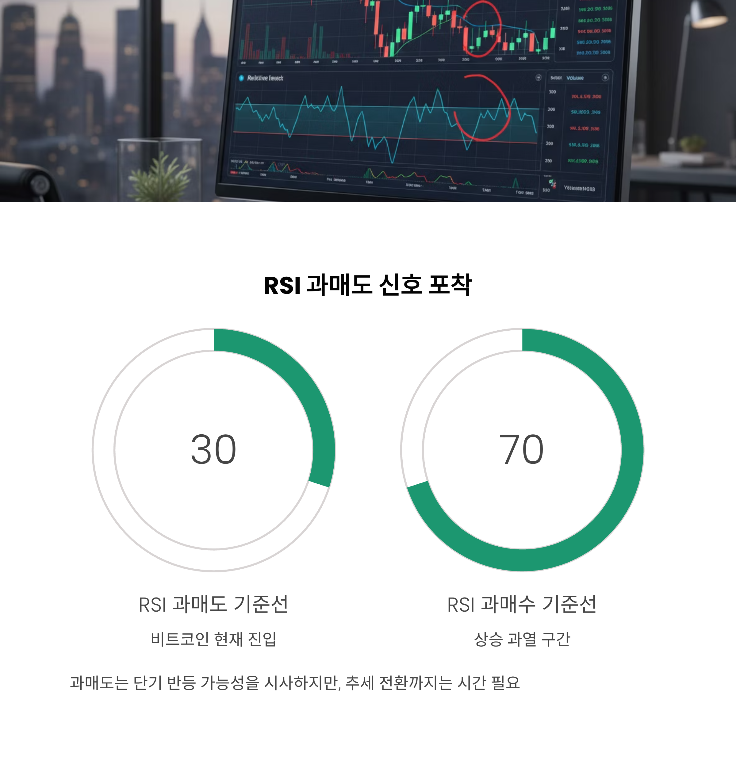 비트코인의 14일 상대강도지수(RSI)가 30 이하로 떨어지면서 과매도 구간에 진입했습니다.