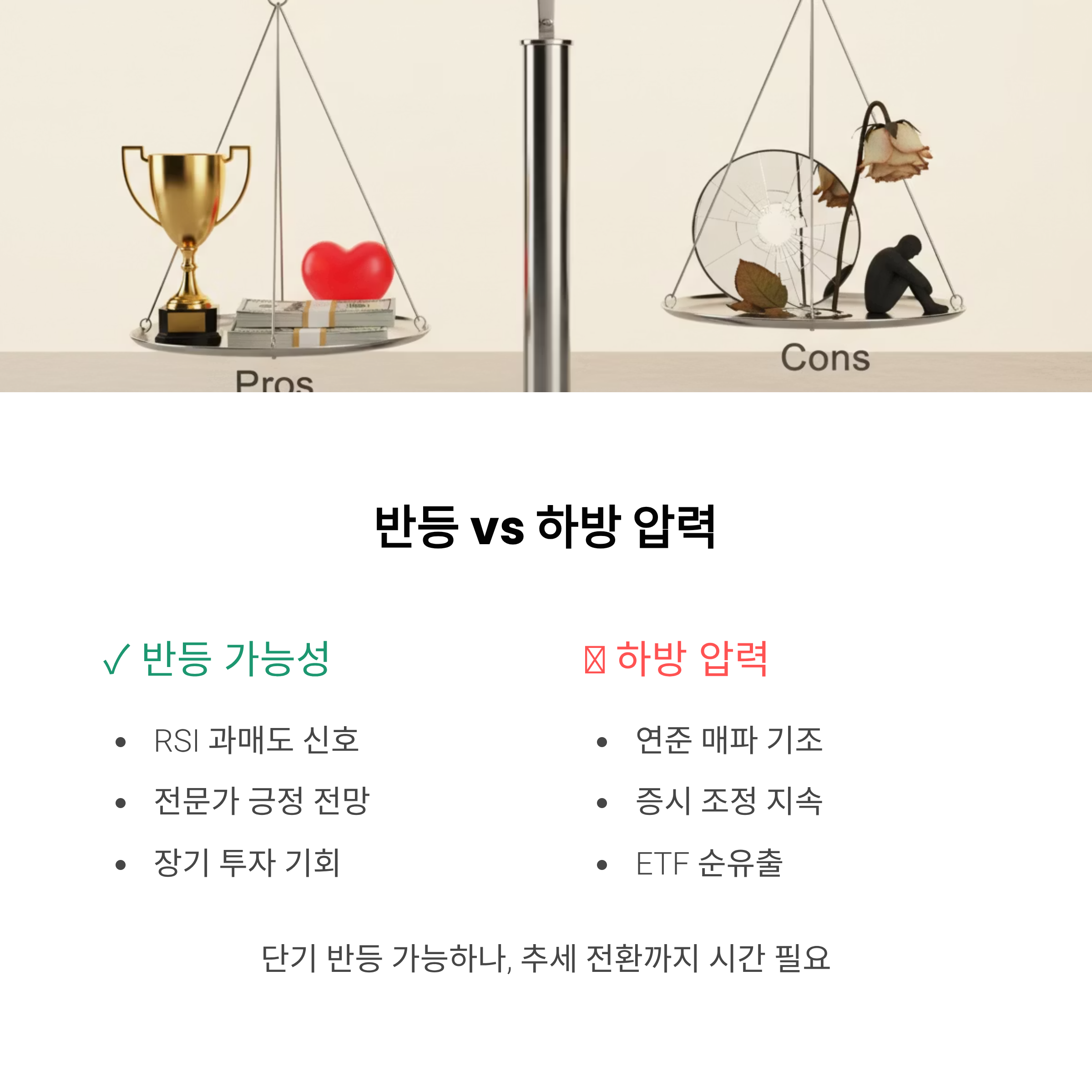 RSI 과매도 신호와 전문가 의견은 단기 반등 가능성을 시사합니다. 그러나 다음 요인은 여전히 하방 압력을 유지합니다.