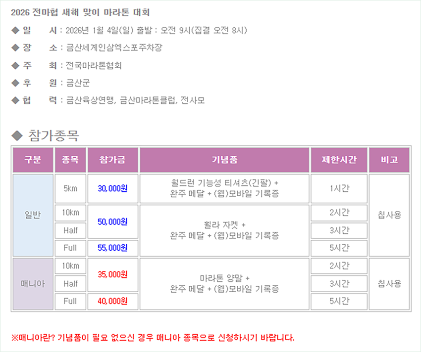 1월 4일 충남 금산에서 열리는 전마협 새해 맞이 마라톤은 합리적인 참가비와 선택 가능한 기념품 옵션으로 러너들 사이에서 벌써 화제입니다.